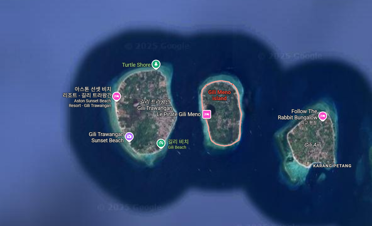 길리 메노 (Gili Meno): 세 섬 중에서 가장 고요하고 평화로운 분위기를 자랑해요. 사람도 가장 적어서 정말 '무인도' 같은 느낌을 원하신다면 딱입니다. 로맨틱한 휴양을 원하는 커플들에게 특히 추천해 드려요. 잔잔한 파도 소리를 들으며 온전한 휴식을 취하기에 최고의 장소랍니다.