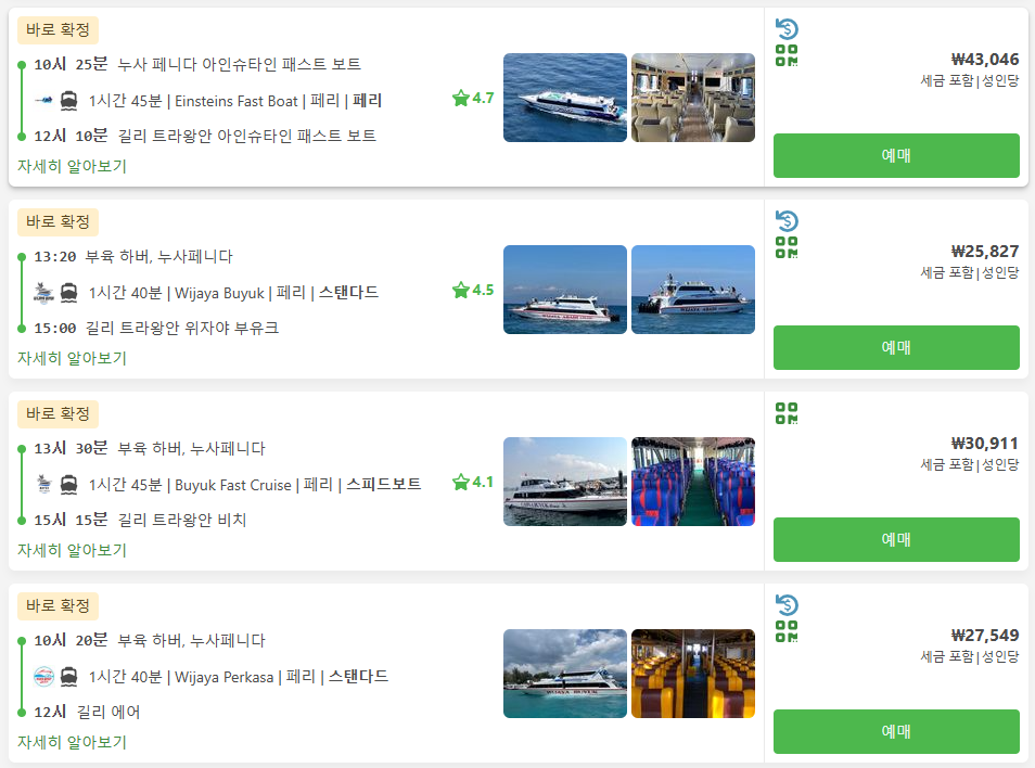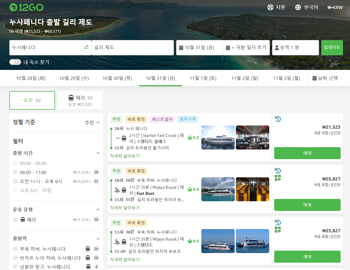 누사페니다에서 길리 제도(길리 트라왕안, 길리 에어, 길리 메노)로 이동하는 교통편 노선정보 및 예약은 12go사이트에서 예약하실 수 있으며, 이 노선 뿐만아니라 나라전역의 노선, 나라간 노선의 검색가능한 모든 교통편을 검색하고 예약하실 수 있습니다. 한국어로 검색해보시고 나오지 않으면 영어로 검색하시면 보다 쉽게 노선을 확인하실 수 있습니다. 모든 교통편은 예약을 빨리 하실 수록 저렴한 가격대의 좌석을 선택하실 수 있으며 하루, 이틀 전에 예약하시려고 하면 원하는 시간대가 없거나 만석으로 예약을 못하실 수 있습니다. 교통편은 미리미리 예약하시는 것을 추천합니다.