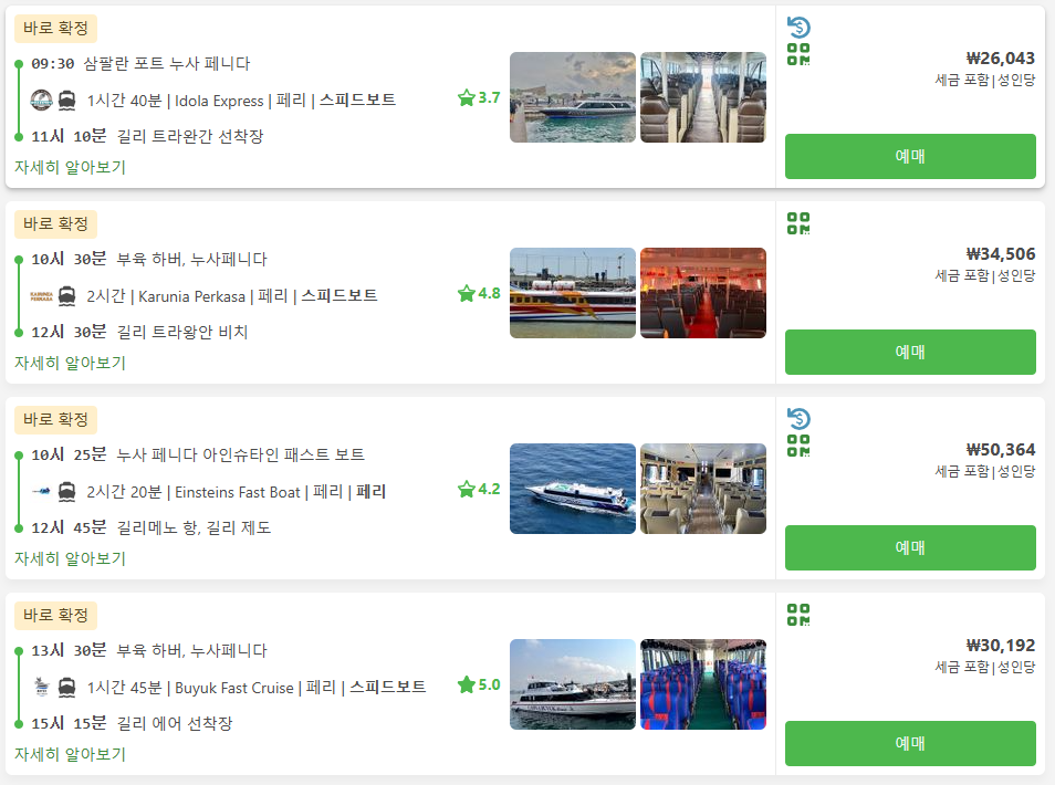 누사페니다에서 길리 제도(길리 트라왕안, 길리 에어, 길리 메노)까지 가시려면 주로 쾌속정(패스트보트)을 이용하시게 될 거예요. 누사페니다의 바이욱= 부육(Buyuk) 항구, 삼팔란 항구(sampalan port), 누사페니다 타니스 등에서 출발하시면 된답니다. 쾌속정은 여러 번 환승하는 복잡함 없이 빠르고 편안하게 이동할 수 있어서 여행객들에게 인기가 많아요.