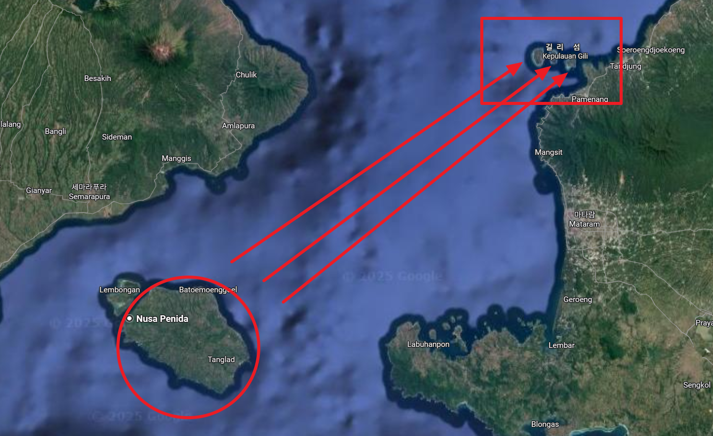 인도네시아 누사렘봉안과 누사 페니다, 두 섬 사이의 거리는 생각보다 아주 가깝답니다. 약 3마일, 즉 대략 4킬로미터 정도 떨어져 있어요. 그래서 패스트보트를 이용하면 15분 만에 누사 페니다
