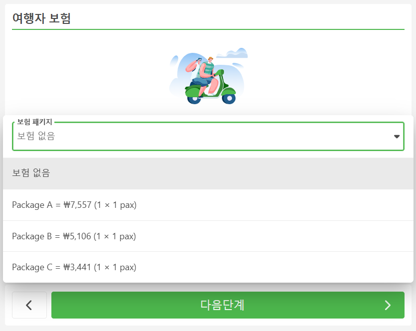 +82) 모두 가능), 이메일, 이름, 성, 성별선택, 국적을 입력하고 여행자 보험은 선택사항입니다.