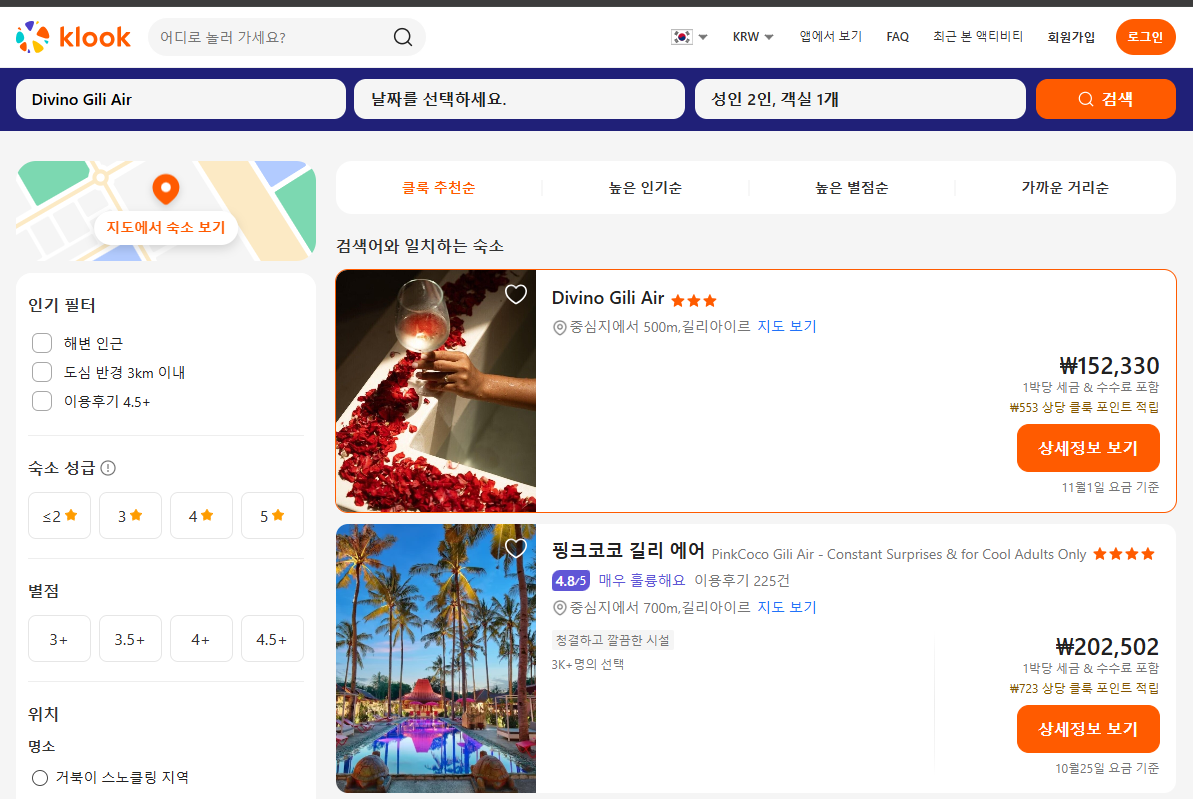 디비노 길리 아이르(Divino Gili Air)의 1박당 요금 최저 가격대(세금 및 봉사료 포함)는 아고다웹사이트에서 할인특가 가격으로 매일매일 변동되며 20만원대부터 다양하게 형성됩니다. 날짜별로 매일 가격이 다르므로 아고다웹사이트 최저가를 확인하시려면 아래 링크를 누르시고 원하는 날짜의 가격대를 선택해야 정확한 가격을 자세히 보실 수 있습니다. 클룩에서도 예약가능하니 여행날짜에 맞춰 요금 및 옵션을 비교해서 예약하시는 것을 추천합니다.