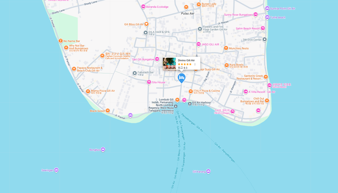 디비노 길리 아이르 호텔은 길리 아이르의 중심부에서 약 0.8km 떨어진 곳에 위치해 있어요. 섬이 작고 동력 운송 수단이 없기 때문에, 이 정도 거리면 시내 중심의 상점이나 레스토랑, 다른 편의시설들에 걸어서나 자전거로 쉽게 접근할 수 있답니다. 길리 아이르 자체가 평화롭고 조용한 분위기라, 호텔 주변 역시 번잡하지 않고 아름다운 자연 경관을 즐기기에 아주 좋을 거예요.