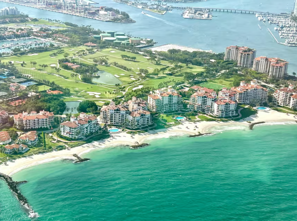 점점 더 마이애미 중심부로 다가갈수록, 고급스러움의 정점인 피셔 아일랜드가 눈에 들어올 겁니다. 이 섬은 접근 자체가 까다로운 초호화 주거 지역으로, 하늘 위에서 그 모습을 확인하는 것 자체가 특권처럼 느껴질 거예요. 섬 전체를 가득 메운 고급스러운 저택들과 개인 요트 선착장, 푸른 골프 코스 등이 비스케인 만 한가운데에서 빛나고 있습니다. 마치 동화 속에 나오는 '부자들의 섬'을 내려다보는 듯한 이국적인 광경에 감탄사가 절로 나올 거예요.