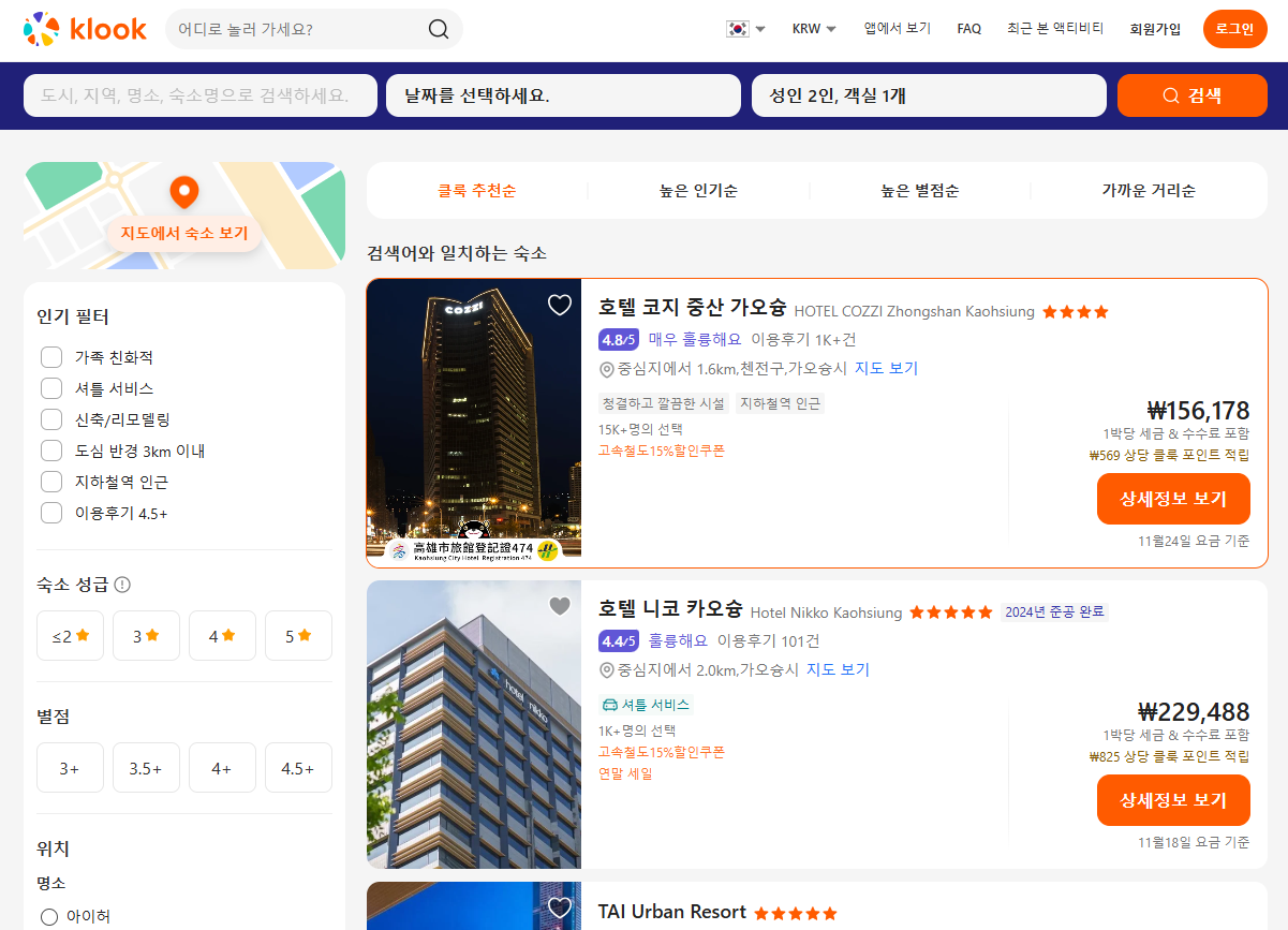 호텔 코지 중산 가오슝 (HOTEL COZZI Kaohsiung Zhongshan)의 1박당 요금 최저 가격대(세금 및 봉사료 포함)는 아고다웹사이트에서 할인특가 가격으로 매일매일 변동되며 10만원대부터 다양하게 형성됩니다. 날짜별로 매일 가격이 다르므로 아고다웹사이트 최저가를 확인하시려면 아래 링크를 누르시고 원하는 날짜의 가격대를 선택해야 정확한 가격을 자세히 보실 수 있습니다. 클룩에서도 예약가능하니 여행날짜에 맞춰 요금 및 옵션을 비교해서 예약하시는 것을 추천합니다.