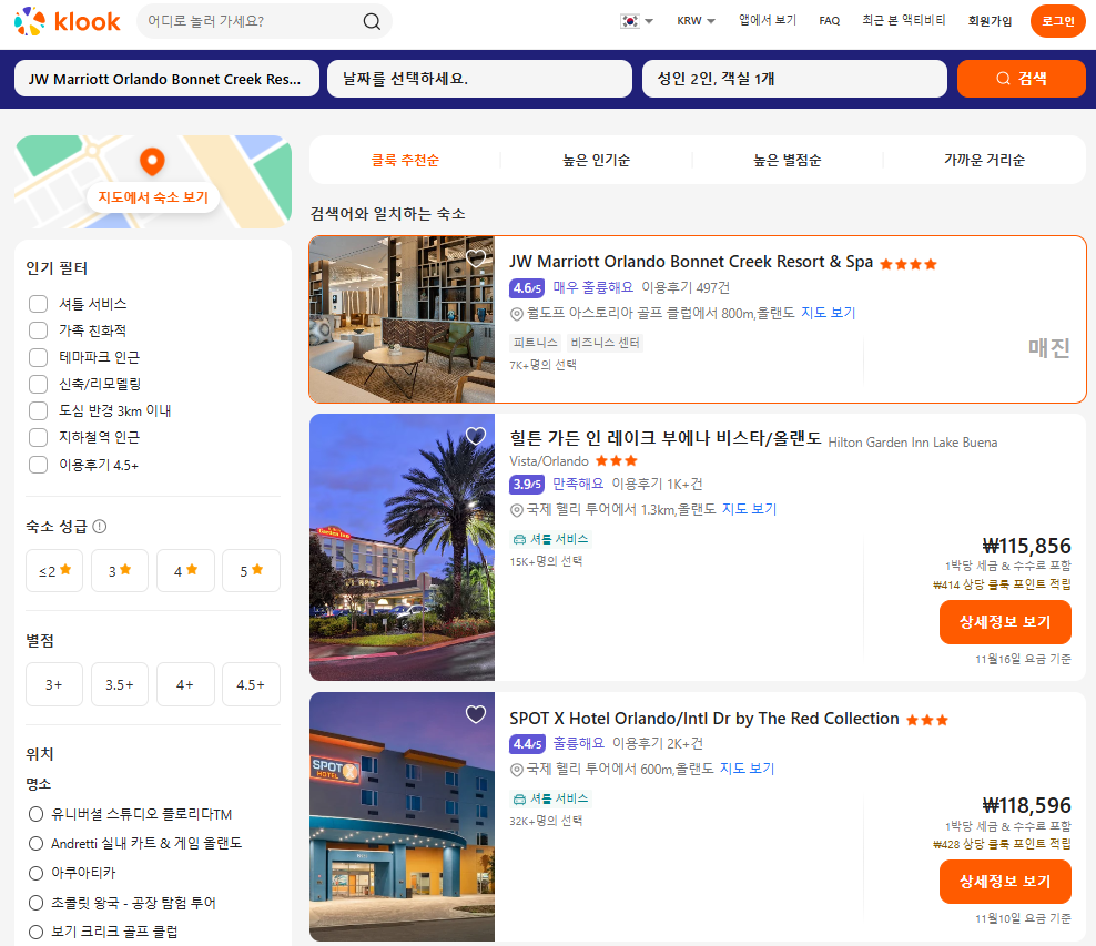 JW 메리어트 올랜도 보닛 크릭 리조트 앤 스파 (JW Marriott Orlando Bonnet Creek Resort & Spa)의 1박당 요금 최저 가격대(세금 및 봉사료 포함)는 아고다웹사이트에서 할인특가 가격으로 매일매일 변동되며 10만원대부터 다양하게 형성됩니다. 날짜별로 매일 가격이 다르므로 아고다웹사이트 최저가를 확인하시려면 아래 링크를 누르시고 원하는 날짜의 가격대를 선택해야 정확한 가격을 자세히 보실 수 있습니다. 클룩에서도 예약가능하니 여행날짜에 맞춰 요금 및 옵션을 비교해서 예약하시는 것을 추천합니다.