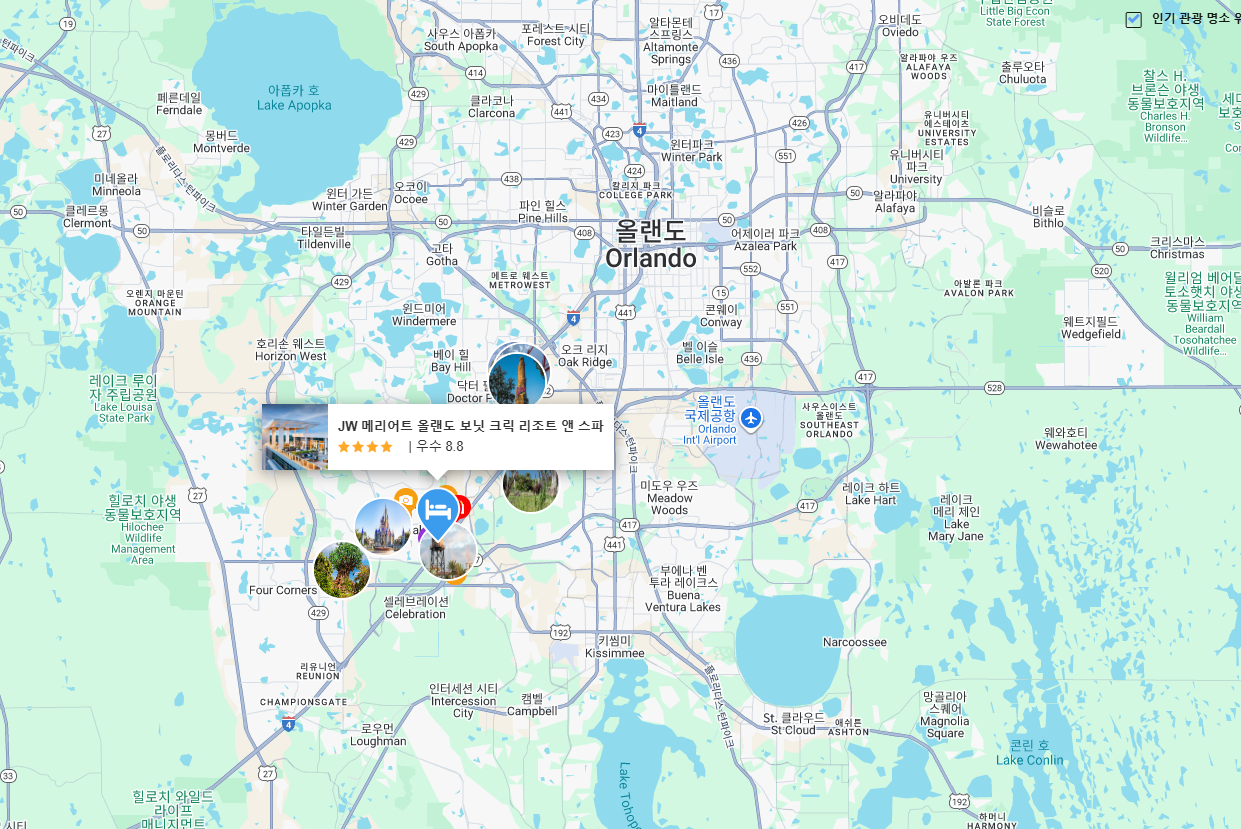 올랜도 국제공항: 공항에서 약 23.0km (또는 35km) 거리에 있어, 이동이 편리한 편입니다.