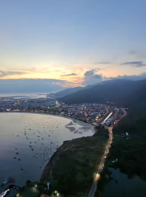 그리고 시선을 더 낮추면, 자연의 색채와 인간의 삶이 어우러진 다채로운 풍경이 펼쳐집니다. 작은 어촌 마을의 알록달록한 지붕들과 고기잡이배들이 잔잔한 바다 위를 오가는 모습은 한가로우면서도 정겨운 삶의 터전을 보여주죠. 바다 위를 가르는 파도와 배들이 만들어내는 물결의 그림자는 마치 움직이는 예술 작품 같아요. 그리고 그 너머로는 휘황찬란한 다낭의 도시 경관이 위풍당당하게 그 모습을 드러냅니다. 용의 다리(드래곤 브리지)나 사랑의 다리 같은 상징적인 건축물들이 미니어처처럼 보이고, 고층 건물들이 빼곡히 들어선 도심의 스카이라인은 그 자체로 현대적이고 활기찬 다낭의 에너지를 느낄 수 있게 해줍니다.