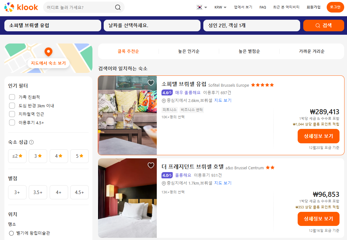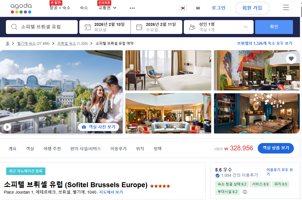 소피텔 브뤼셀 유럽 (Sofitel Brussels Europe)의 1박당 요금 최저 가격대(세금 및 봉사료 포함)는 아고다웹사이트에서 할인특가 가격으로 매일매일 변동되며 10만원대부터 다양하게 형성됩니다. 날짜별로 매일 가격이 다르므로 아고다웹사이트 최저가를 확인하시려면 아래 링크를 누르시고 원하는 날짜의 가격대를 선택해야 정확한 가격을 자세히 보실 수 있습니다. 클룩에서도 예약가능하니 여행날짜에 맞춰 요금 및 옵션을 비교해서 예약하시는 것을 추천합니다.