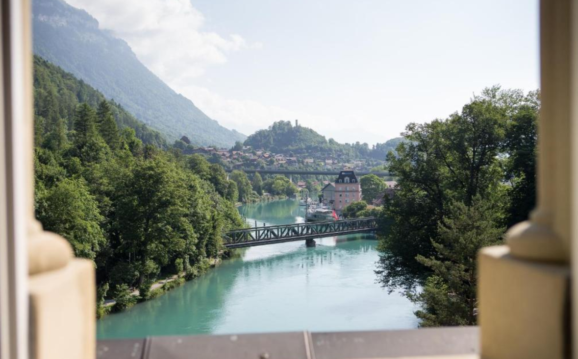 뛰어난 접근성과 환상적인 주변 환경: 호텔은 인터라켄 동역에서 도보로 단 5분 거리에 위치해 있어, 기차를 이용하는 여행객분들에게 최상의 편리함을 제공합니다. 역에서 내리는 순간부터 스위스 알프스 여행의 설렘을 만끽하며 호텔로 향할 수 있죠. 특히, 호텔 바로 옆으로는 그림처럼 아름다운 아레(Aare) 강이 유유히 흐르고 있어, 객실 창문이나 테라스에서 바라보는 풍경은 그 자체로 한 폭의 예술 작품 같답니다. 아레 강과 주변의 푸른 자연은 도시의 번잡함에서 벗어나 진정한 휴식을 선사합니다.