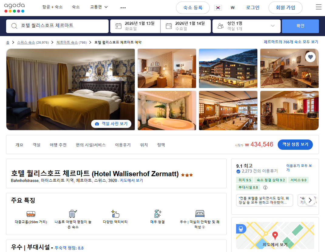 Hotel Walliserhof Zermatt (호텔 발리저호프 체르마트)의 1박당 요금 최저 가격대(세금 및 봉사료 포함)는 아고다웹사이트에서 할인특가 가격으로 매일매일 변동되며 10만원대부터 다양하게 형성됩니다. 날짜별로 매일 가격이 다르므로 아고다웹사이트 최저가를 확인하시려면 아래 링크를 누르시고 원하는 날짜의 가격대를 선택해야 정확한 가격을 자세히 보실 수 있습니다. 클룩에서도 예약가능하니 여행날짜에 맞춰 요금 및 옵션을 비교해서 예약하시는 것을 추천합니다.
