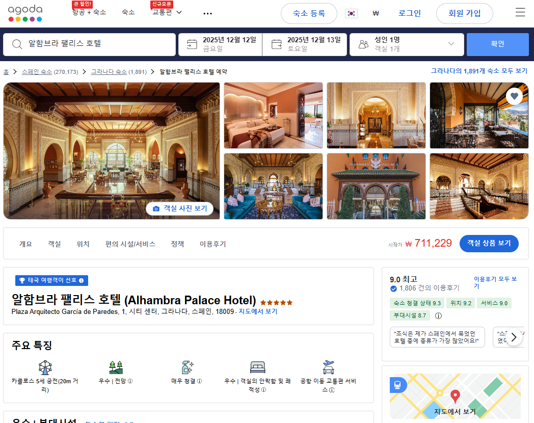 알함브라 팰리스 호텔은 단순한 숙소를 넘어, 그라나다의 역사와 아름다움을 온몸으로 느끼고 싶은 분들께 정말 특별한 경험을 선사해 줄 거예요! 그라나다 알함브라 팰리스 호텔(Alhambra Palace Hotel)의 1박당 요금 최저 가격대(세금 및 봉사료 포함)는 아고다웹사이트에서 할인특가 가격으로 매일매일 변동되며 10만원대부터 다양하게 형성됩니다. 날짜별로 매일 가격이 다르므로 아고다웹사이트 최저가를 확인하시려면 아래 링크를 누르시고 원하는 날짜의 가격대를 선택해야 정확한 가격을 자세히 보실 수 있습니다. 클룩에서도 예약가능하니 여행날짜에 맞춰 요금 및 옵션을 비교해서 예약하시는 것을 추천합니다.