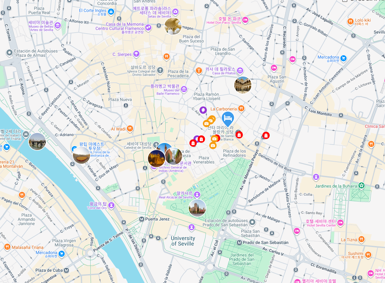 - 유네스코 세계 문화유산인 알카사르 궁전까지는 단 5분, 웅장한 세비야 대성당과 히랄다 탑까지는 10~15분 거리예요.