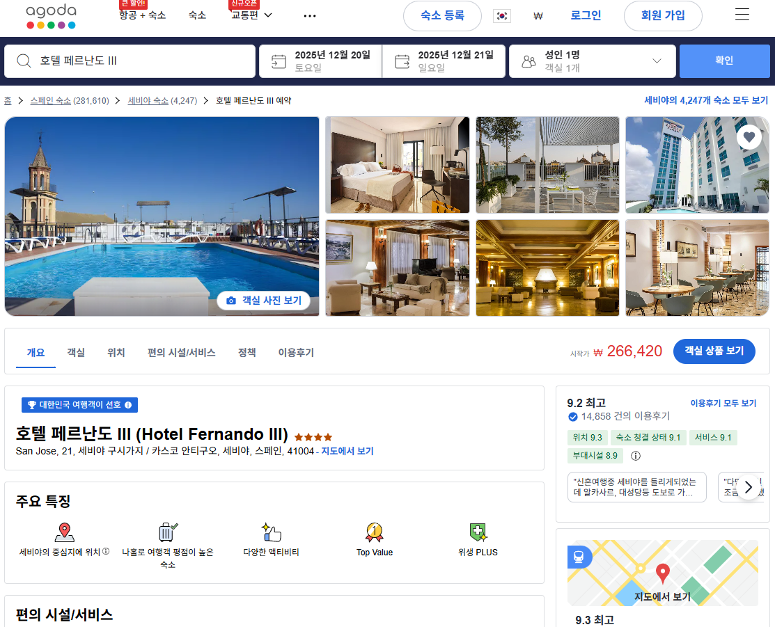 호텔 페르난도 III는 이러한 장점들 덕분에 세비야에서 가족 모두가 편안하고 즐거운 시간을 보내기에 더할 나위 없이 좋은 선택이 될 거예요! 세비야 호텔 페르난도 III (Hotel Fernando III)의 1박당 요금 최저 가격대(세금 및 봉사료 포함)는 아고다웹사이트에서 할인특가 가격으로 매일매일 변동되며 10 ~ 20만원대부터 다양하게 형성됩니다. 날짜별로 매일 가격이 다르므로 아고다웹사이트 최저가를 확인하시려면 아래 링크를 누르시고 원하는 날짜의 가격대를 선택해야 정확한 가격을 자세히 보실 수 있습니다.