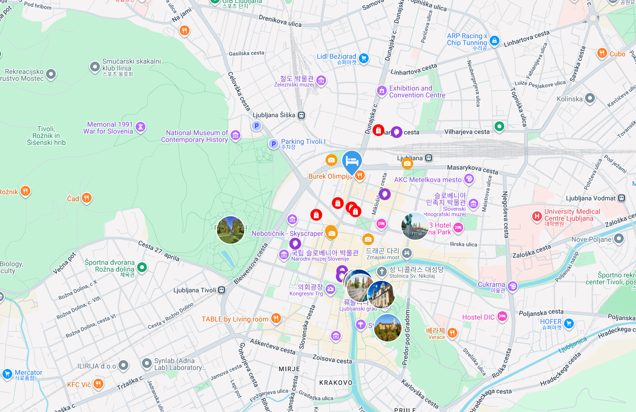 구시가지: 류블랴나의 역사와 문화를 느낄 수 있는 구시가지도 호텔에서 가까운 거리에 있어요. 아기자기한 상점들과 카페, 레스토랑이 늘어선 거리를 거닐며 류블랴나만의 독특한 매력을 온전히 경험하실 수 있을 거예요.