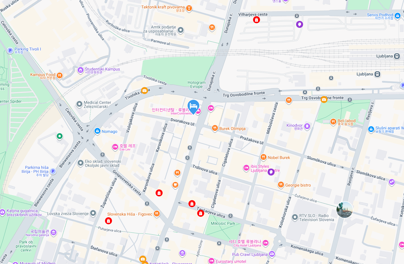 류블랴나 기차역: 호텔은 류블랴나 기차역 바로 근처에 위치해 있어요. 기차역에서 호텔까지 이동하는 데 전혀 어려움이 없고, 다른 도시로 이동할 계획이 있으시다면 더욱 편리하게 이용하실 수 있습니다. 객실에서 기차역의 전경이 보인다고 하니, 창밖 풍경을 보는 재미도 쏠쏠할 거예요.