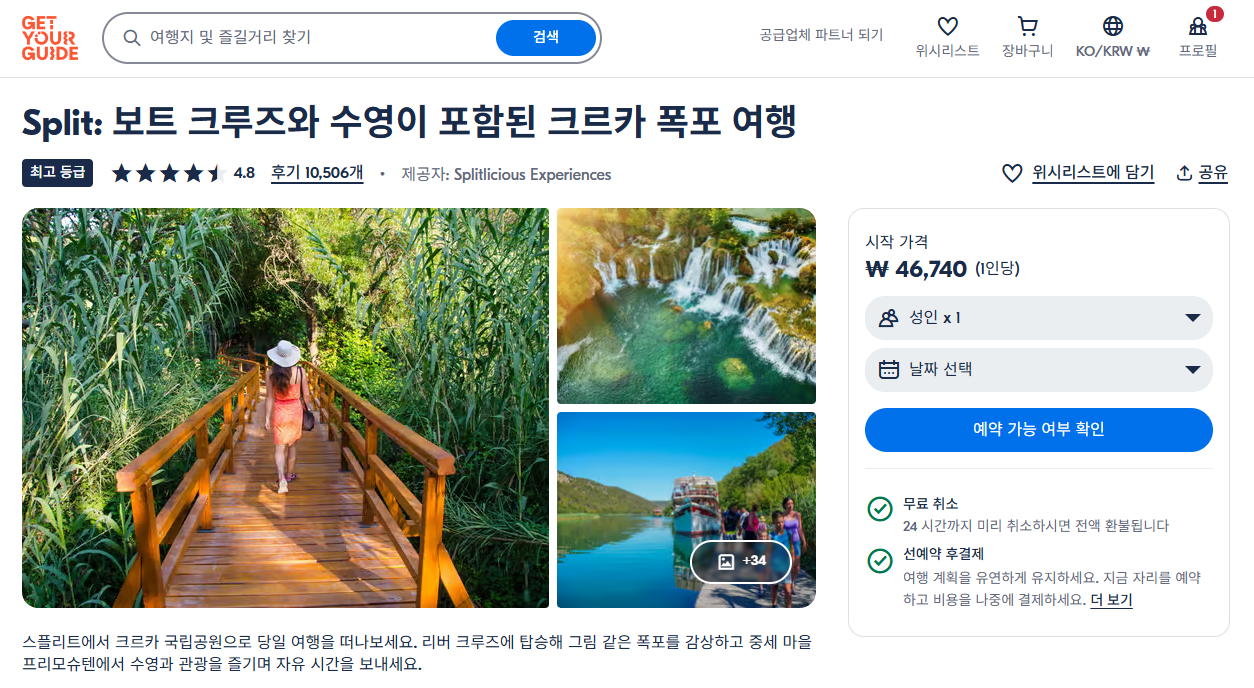 스플리트여행에 추천하는 크르카 국립공원 리버크루즈와 크르카 폭포, 중세마을 프리모슈텐 투어는 GET YOUR GUIDE 사이트에서 예약하실 수 있습니다. 사이트는 특히 전세계 대부분의 나라, 지역의 투어, 교통편 있어, 쉽게 찾을 수 없는 여행지의 다양한 투어 및 서비스를 이용할 수 있는 글로벌 사이트입니다. 전세계 여행자들이 많이 사용하는 사이트로 한국분들이 많이 예약하는 투어를 찾으신다면 klook 여행사이트 추천합니다. 함께 사용하시면 더욱 편하게 여행하실 수 있습니다.