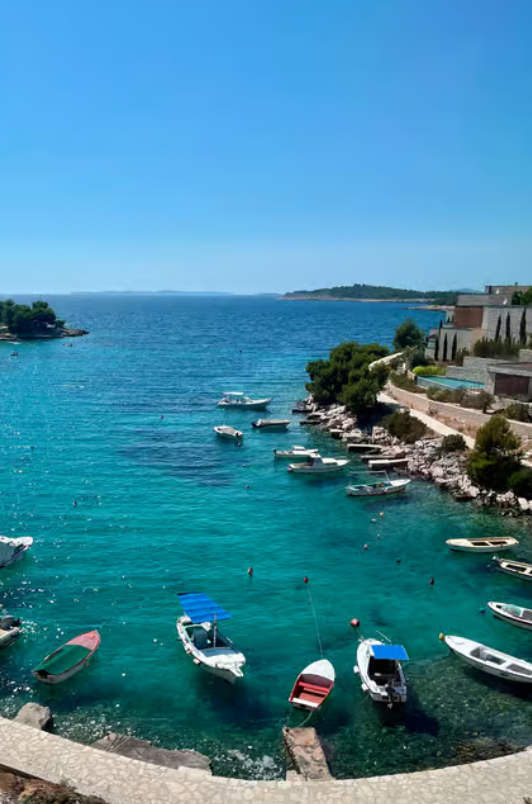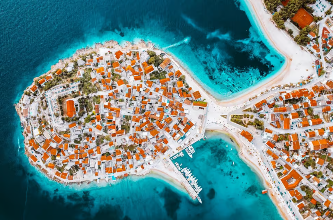 프리모슈텐(Primošten)은 크로아티아 스플리트에서 차로 약 한 시간 거리에 위치한 작고 한적한 해안 마을이에요. 원래는 아드리아 해 위에 떠 있는 작은 섬이었지만, 세월이 흐르면서 육지와 다리로 연결되어 이제는 차로도 편하게 이동할 수 있게 되었답니다. 마치 육지가 섬을 품어 안은 듯한 독특한 지형은 프리모슈텐을 더욱 신비롭게 만들어요.