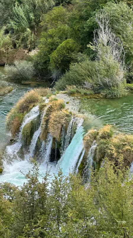석회화 장벽 형성: 이렇게 형성된 미세한 장벽들이 오랜 시간 동안 조금씩 쌓이고 커지면서 강을 가로막는 자연적인 댐을 만들게 돼요. 이 댐은 계속해서 성장하며, 윗부분이 넘쳐흐르면서 여러 개의 폭포 단을 형성하게 됩니다. 바로 이 석회화 장벽 덕분에 크르카의 폭포들은 수직으로 떨어지는 것이 아니라, 여러 개의 계단식 단을 이루며 아름답게 흘러내리게 되는 거예요.
