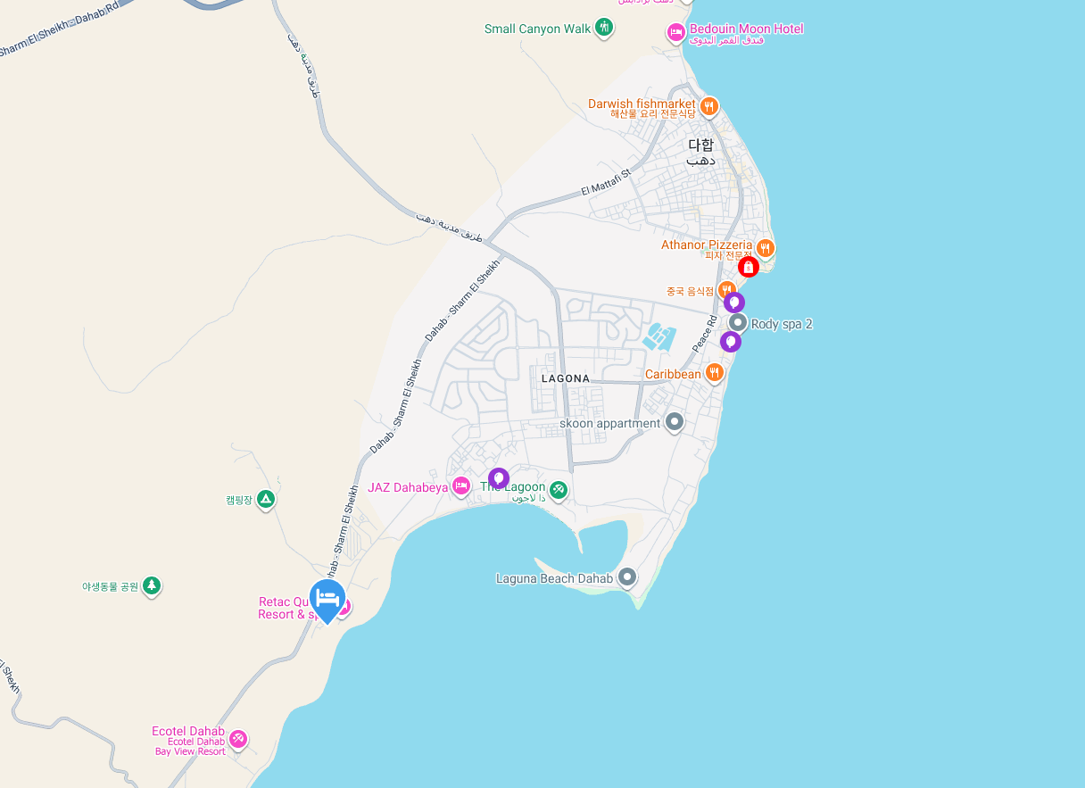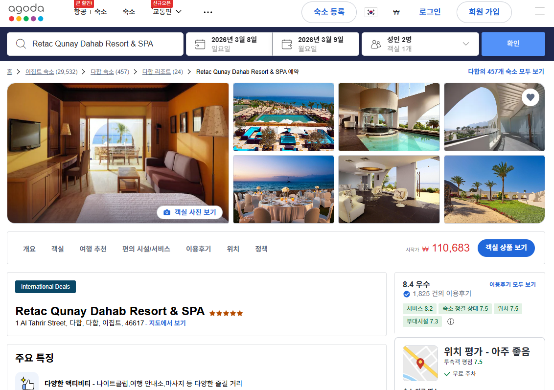 레탁 쿠나이 다합 리조트 & 스파는 이렇게 아름다운 자연 속에서 편안하고 특별한 경험을 선사하는 곳이니, 다합 여행에 꼭 기억해두시면 좋을 거예요! 레탁 쿠나이 다합 리조트 & 스파(Retac Qunay Dahab Resort & SPA)의 1박당 요금 최저 가격대(세금 및 봉사료 포함)는 아고다웹사이트에서 할인특가 가격으로 매일매일 변동되며 객실에 따라 10만원대부터 다양하게 형성됩니다. 날짜별로 매일 가격이 다르므로 아고다웹사이트 최저가를 확인하시려면 아래 링크를 누르시고 원하는 날짜의 가격대를 선택해야 정확한 가격을 자세히 보실 수 있습니다.