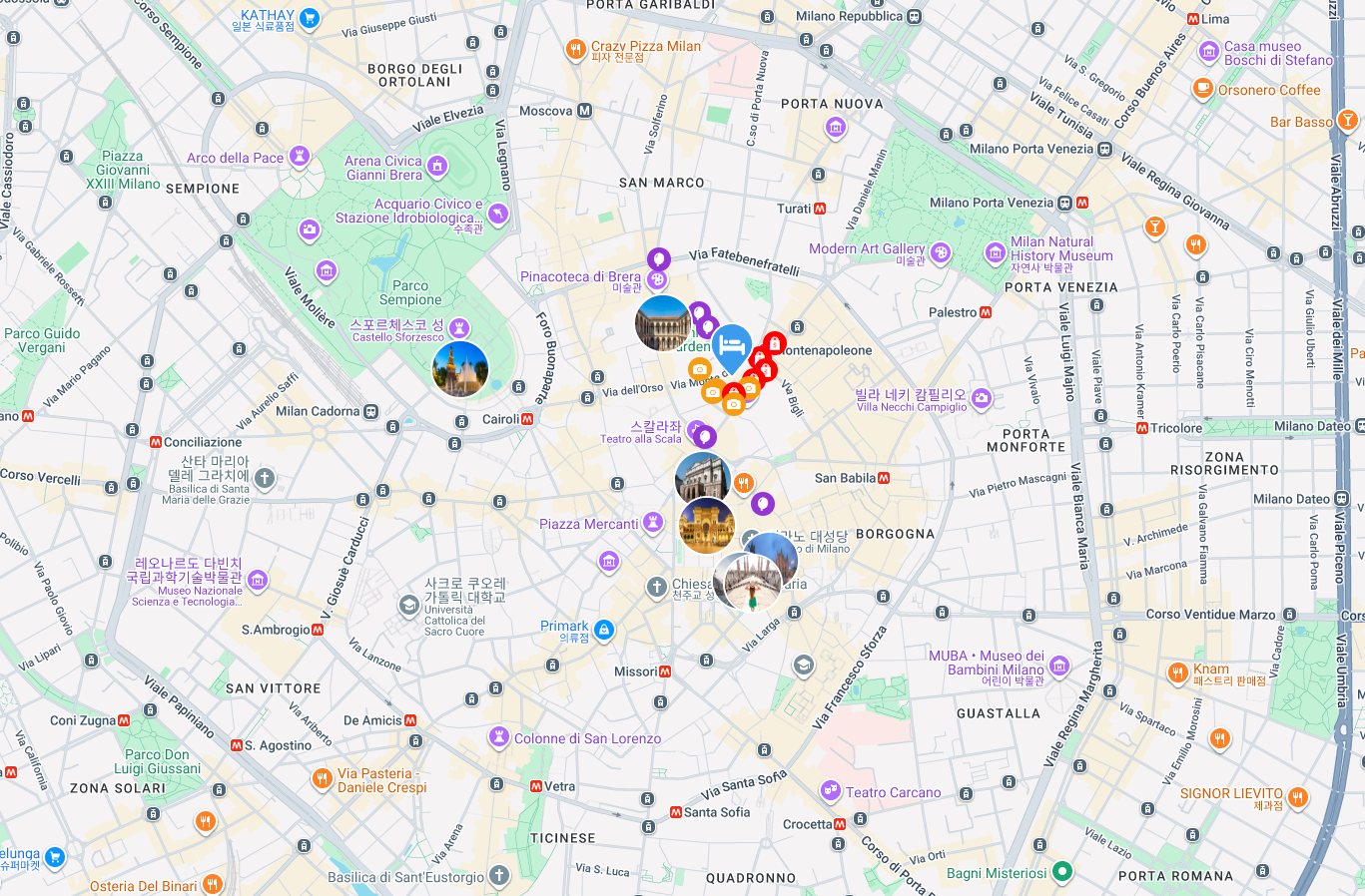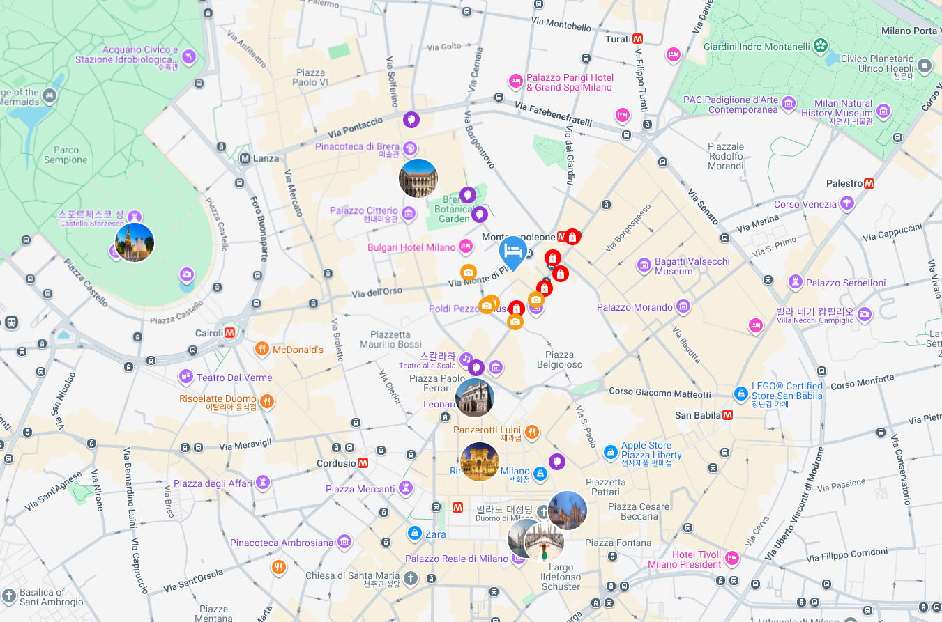 브레라 지구(Brera District): 예술적인 분위기로 유명한 브레라 지구와 브레라 미술관도 가까워요. 고풍스러운 골목길을 거닐며 아기자기한 상점들을 구경하거나 길거리 아티스트들의 작품을 감상하기에도 좋습니다.