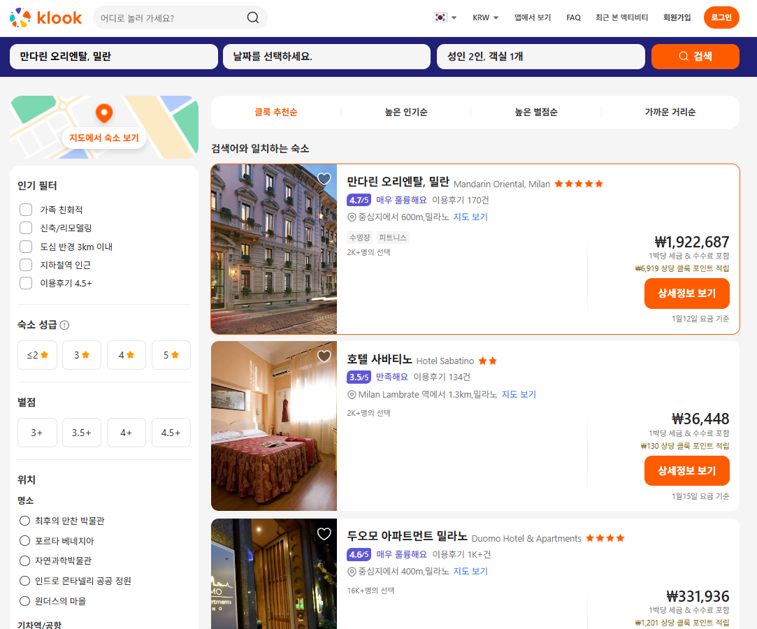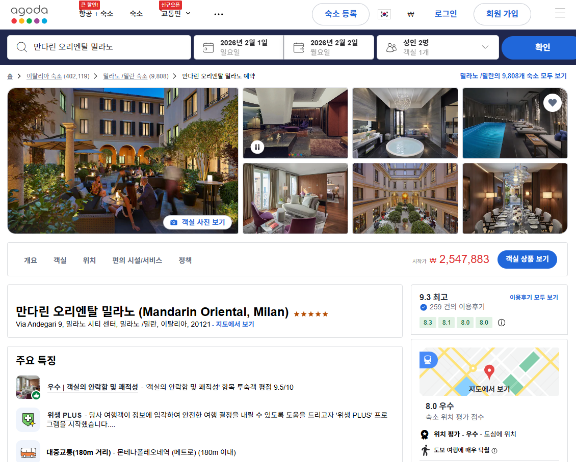이 모든 장점들이 가족에게 잊지 못할 밀라노 여행의 추억을 선사할 거예요! 만다린 오리엔탈, 밀라노 (Mandarin Oriental, Milan)의 1박당 요금 최저 가격대(세금 및 봉사료 포함)는 아고다웹사이트에서 할인특가 가격으로 매일매일 변동되며 객실에 따라 200만원대부터 다양하게 형성됩니다. 날짜별로 매일 가격이 다르므로 아고다웹사이트 최저가를 확인하시려면 아래 링크를 누르시고 원하는 날짜의 가격대를 선택해야 정확한 가격을 자세히 보실 수 있습니다.