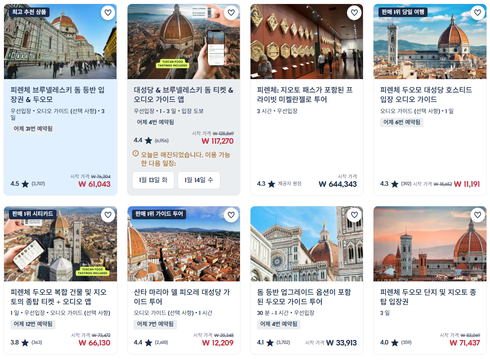 피렌체 브루넬레스키 돔과 피렌체 대성당 티켓은 클룩사이트 사이트에서 예약하실 수 있습니다. 사이트는 특히 전세계 대부분의 나라, 지역의 투어, 교통편 등을 쉽게 찾을 수 있는 한국분들이 많이 사용하는 글로벌 사이트입니다. 그리고 전세계 여행자들이 많이 예약하는 투어를 찾으신다면 GET YOUR GUIDE 사이트 추천합니다. 함께 사용하시면 더욱 편하게 여행하실 수 있습니다.