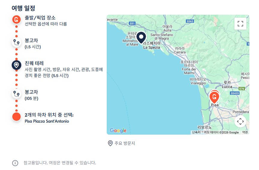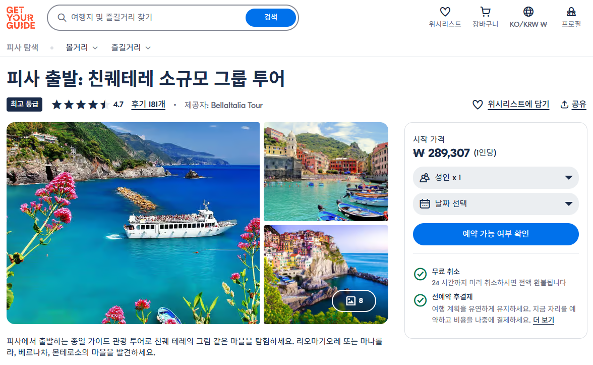 친퀘테레의 하이킹 코스를 걸으면서 숨겨진 절경들을 마음껏 눈에 담으시길 바라요! 걷는 발걸음마다 새로운 아름다움을 발견하실 수 있을 거예요. 친퀘테레자유여행으로 즐기는 것도 좋지만 교통편이 포함된 현지투어에 참여하시면 주요 명소를 쉽고 편하게 즐기실 수 있습니다. 피사에서 출발하는 9시간 코스 친퀘테레 소규모 그룹 투어는 GET YOUR GUIDE 사이트에서 예약하실 수 있습니다. 사이트는 특히 전세계 대부분의 나라, 지역의 투어, 교통편 있어, 쉽게 찾을 수 없는 여행지의 다양한 투어 및 서비스를 이용할 수 있는 글로벌 사이트입니다. 전세계 여행자들이 많이 사용하는 사이트로 한국분들이 많이 예약하는 투어를 찾으신다면 klook 여행사이트 추천합니다. 함께 사용하시면 더욱 편하게 여행하실 수 있습니다.