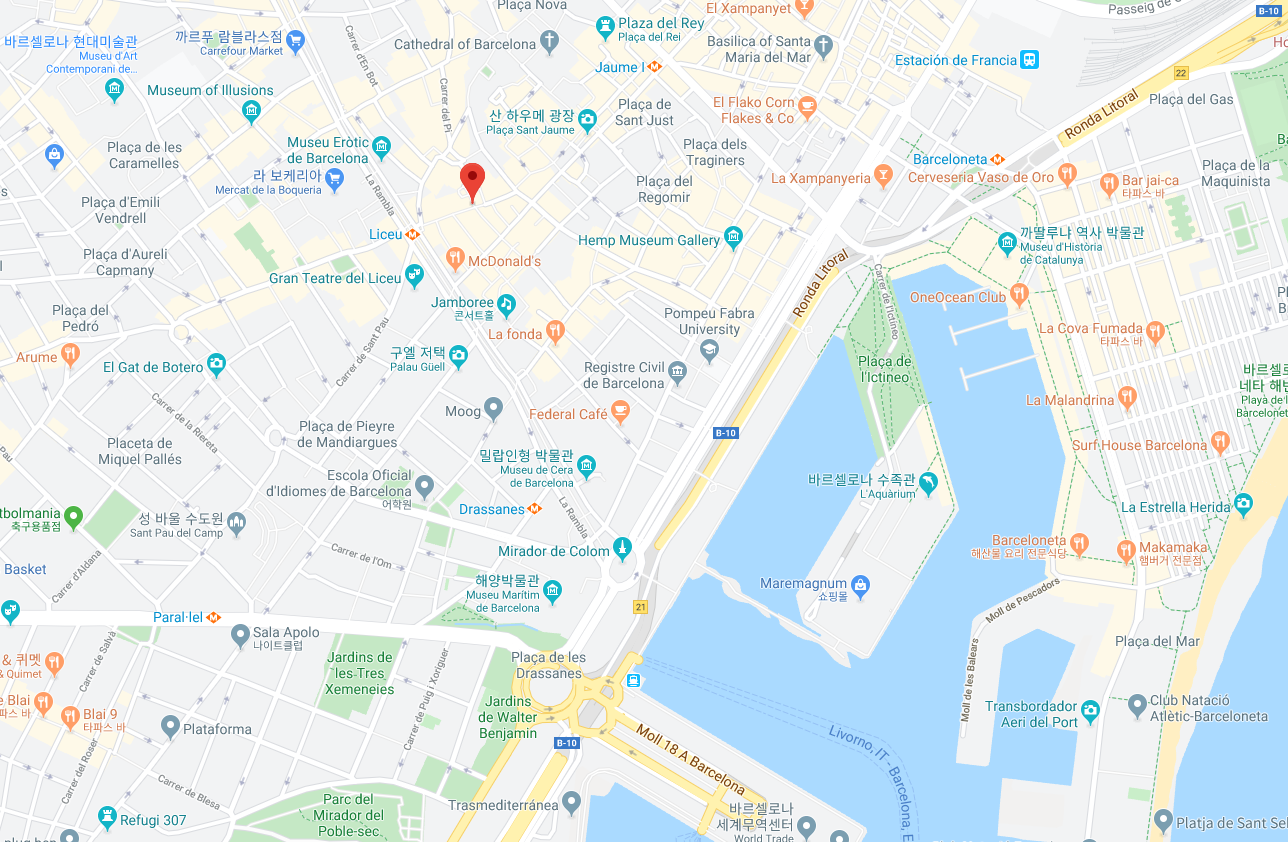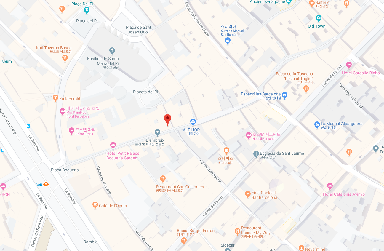 Travel Bar, Carrer de la Boqueria 27, Barri Gòtic, 08002, Barcelona. 모임장소는 미로 모자이크와 (Miró mosaic) 중국 용쪽으로 이어진 람블라스 거리에 있는 (Las Ramblas) 트래블 바 (Travel Bar) 내부입니다.