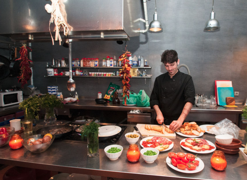본인의 타파스와 수제 핀토스를 즐기는 동안 요리사는