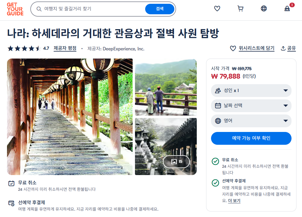 나라 하세데라의 거대한 관음상과 절벽 사원 탐방 투어는 하세데라 역 티켓 게이트 앞에서 모여 시작하며 GET YOUR GUIDE 사이트에서 예약하실 수 있습니다. 사이트는 특히 전세계 대부분의 나라, 지역의 투어, 교통편 있어, 쉽게 찾을 수 없는 여행지의 다양한 투어 및 서비스를 이용할 수 있는 글로벌 사이트입니다. 전세계 여행자들이 많이 사용하는 사이트로 한국분들이 많이 예약하는 투어를 찾으신다면 klook 여행사이트 추천합니다. 함께 사용하시면 더욱 편하게 여행하실 수 있습니다.