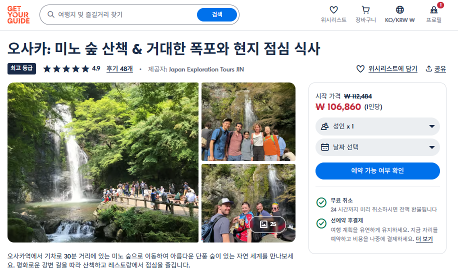 오사카출발 미노 숲 산책 및 미노 폭포, 현지 점심 식사 패키지 투어는 GET YOUR GUIDE 사이트에서 예약하실 수 있습니다. 사이트는 특히 전세계 대부분의 나라, 지역의 투어, 교통편 있어, 쉽게 찾을 수 없는 여행지의 다양한 투어 및 서비스를 이용할 수 있는 글로벌 사이트입니다. 전세계 여행자들이 많이 사용하는 사이트로 한국분들이 많이 예약하는 투어를 찾으신다면 klook 여행사이트 추천합니다. 함께 사용하시면 더욱 편하게 여행하실 수 있습니다.