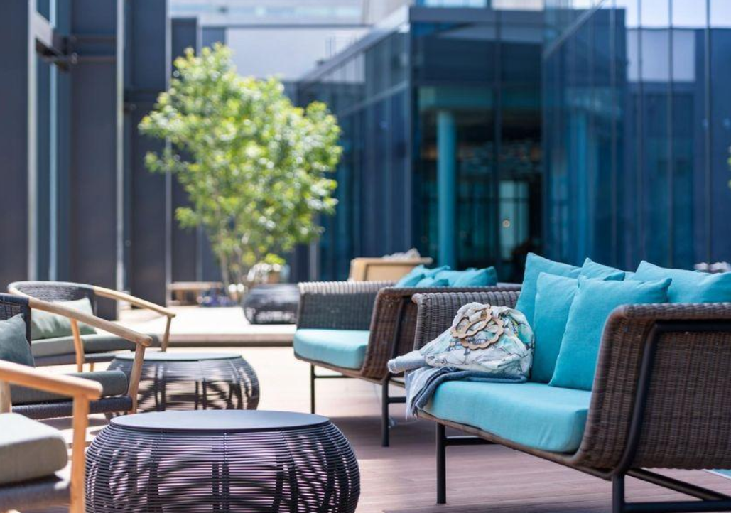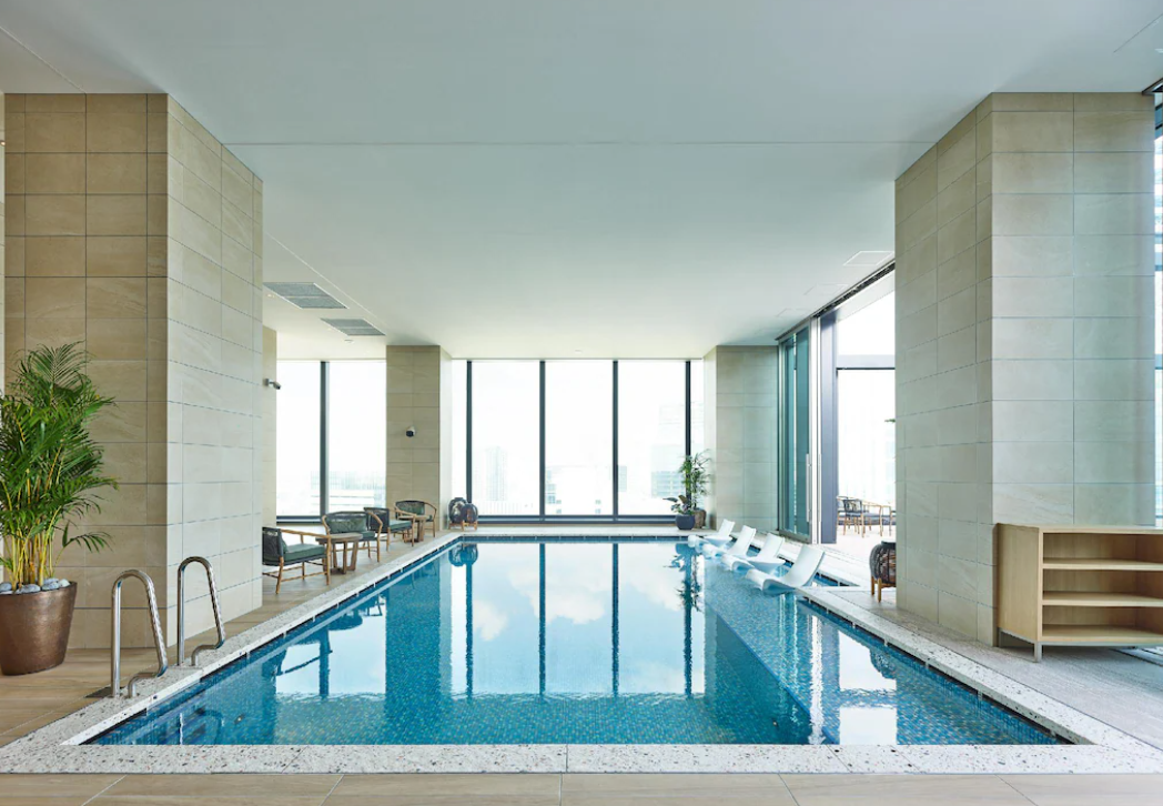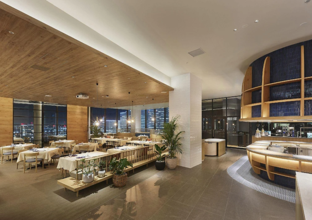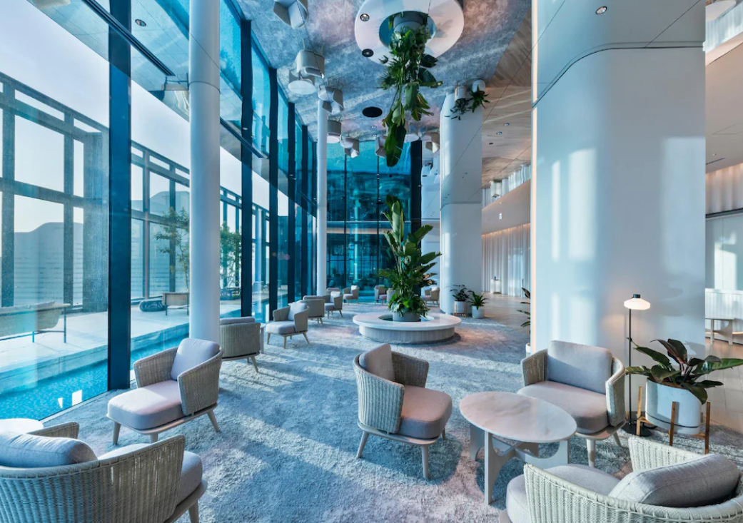 호텔 로비는 20층에 자리 잡고 있어 높은 층고와 은은한 조명, 현대적인 인테리어가 고급스러운 분위기를 자아냅니다. 로비 한편에는 야마하의 그랜드 피아노가 설치되어 있으며 특정 시간 자동 연주가 이루어져 고요하면서도 품격 있는 공간을 완성합니다. 부대시설도 훌륭한데, 수영장과 피트니스 센터, 레스토랑 및 바가 한 층에 집중되어 있어 이용이 편리합니다. 식당 '에볼타'는 아침부터 저녁까지 운영하며 투숙객에게 만족스러운 식사 경험을 제공합니다.