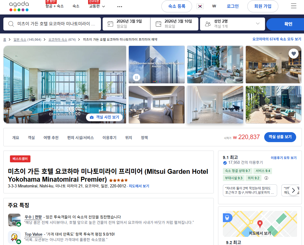 요약하면, 미츠이 가든 호텔 요코하마 미나토미라이 프리미어는 뛰어난 위치와 최신 시설, 쾌적한 객실 환경, 고급스러운 로비 및 편리한 부대시설, 그리고 친절한 서비스가 잘 어우러진 호텔로, 특별한 요코하마 체험과 편안한 숙박을 원하는 여행객에게 매우 적합한 선택지라 할 수 있습니다.