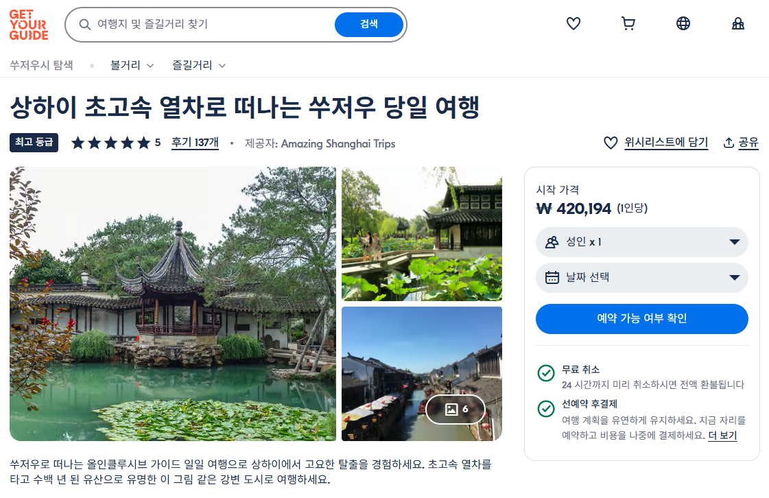 요약하자면, 자연과 역사, 문화를 모두 만끽할 수 있는 쑤저우에서는 졸정원과 사자림 같은 명원, 고대 수로와 거리, 타이거 힐, 박물관, 실크 공방 등이 주요 볼거리로 여행의 다채로운 재미를 선사합니다. 쾌적한 초고속 열차로 연결되어 하루 코스로도 충분히 즐기실 수 있는 매력적인 여행지입니다. 상하이 초고속 열차로 떠나는 쑤저우 당일 투어는 GET YOUR GUIDE 사이트에서 예약하실 수 있습니다. 사이트는 특히 전세계 대부분의 나라, 지역의 투어, 교통편 있어, 쉽게 찾을 수 없는 여행지의 다양한 투어 및 서비스를 이용할 수 있는 글로벌 사이트입니다. 전세계 여행자들이 많이 사용하는 사이트로 한국분들이 많이 예약하는 투어를 찾으신다면 klook 여행사이트 추천합니다. 함께 사용하시면 더욱 편하게 여행하실 수 있습니다.