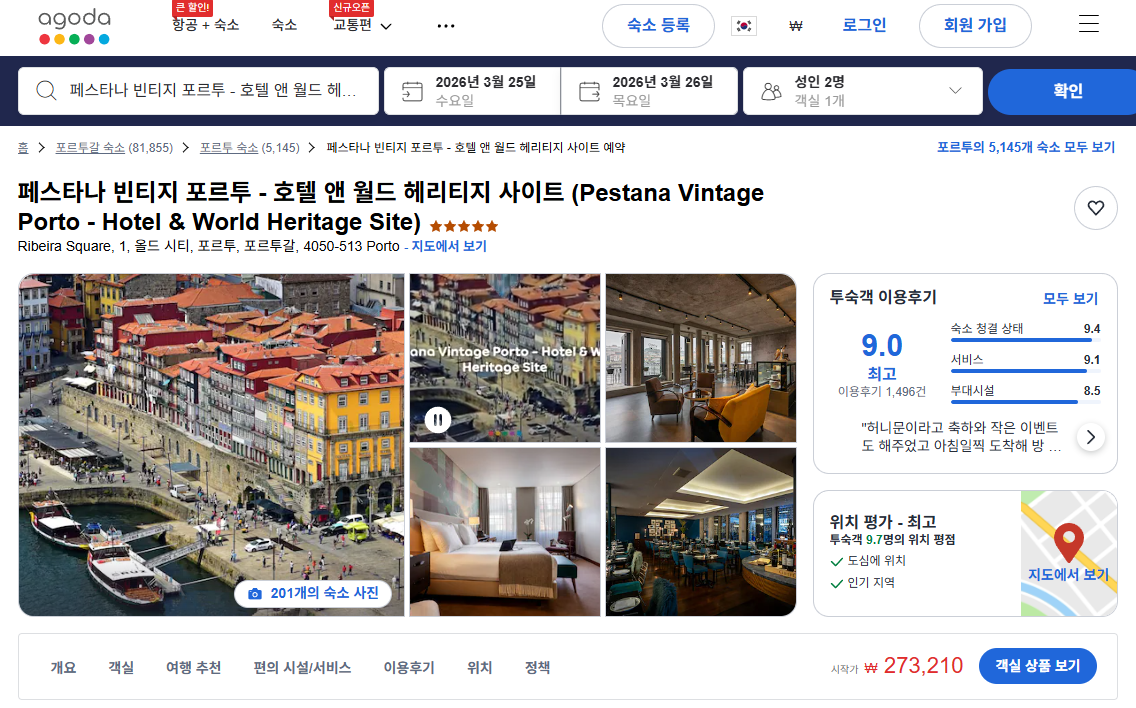 이처럼 페스타나 빈티지 포르투 호텔은 고급스러운 숙박 경험과 더불어 역사·문화 탐방에 최적화된 위치와 편리한 접근성, 그리고 세심한 서비스로 포르투 여행객에게 특별한 가치를 전합니다. 페스타나 빈티지 포르투 - 호텔 앤 월드 헤리티지 사이트 (Pestana Vintage Porto - Hotel & World Heritage Site)의 1박당 요금 최저 가격대(세금 및 봉사료 포함)는 아고다웹사이트에서 할인특가 가격으로 매일매일 변동되며 객실에 따라 10만원대부터 다양하게 형성됩니다. 날짜별로 매일 가격이 다르므로 아고다웹사이트 최저가를 확인하시려면 아래 링크를 누르시고 원하는 날짜의 가격대를 선택해야 정확한 가격을 자세히 보실 수 있습니다.