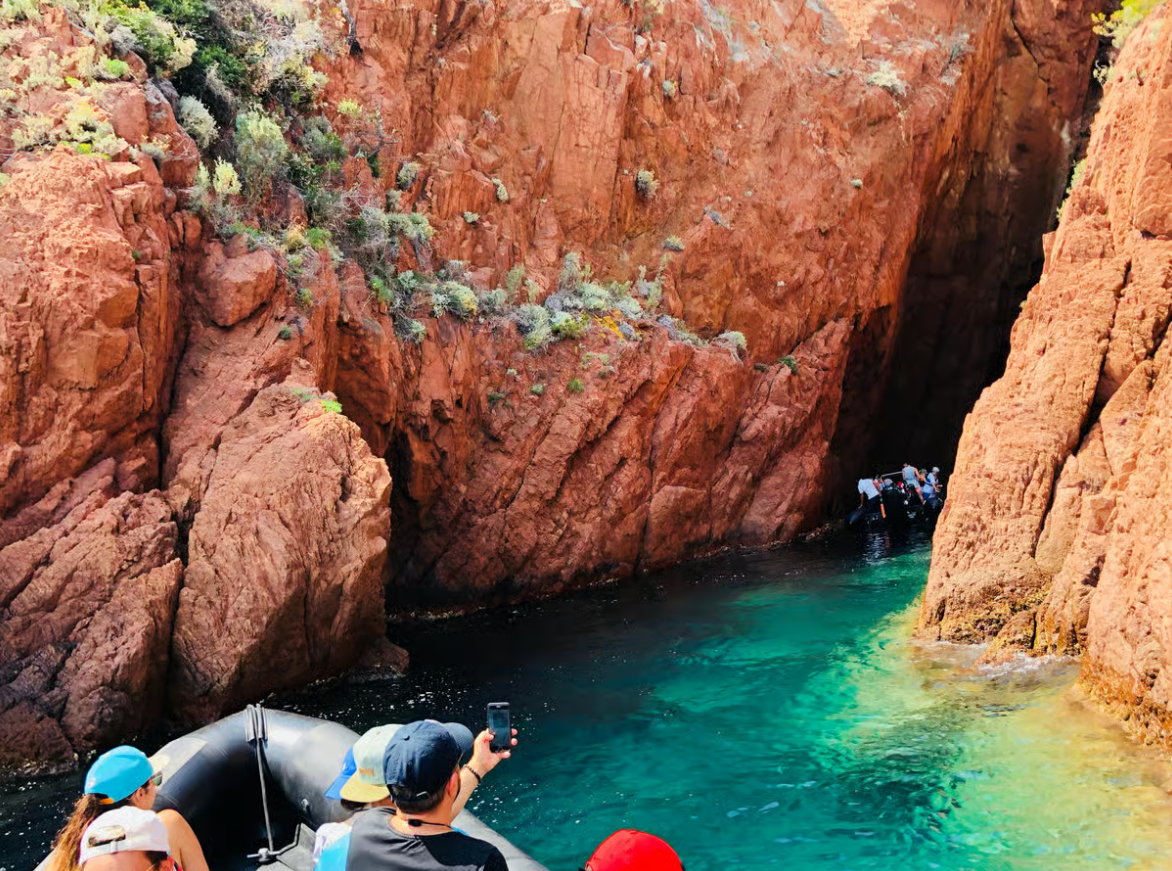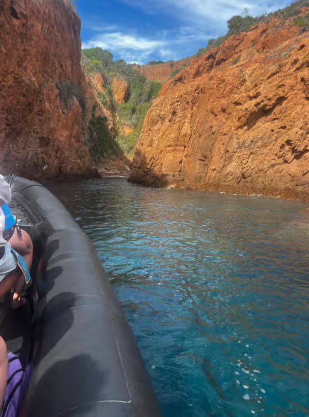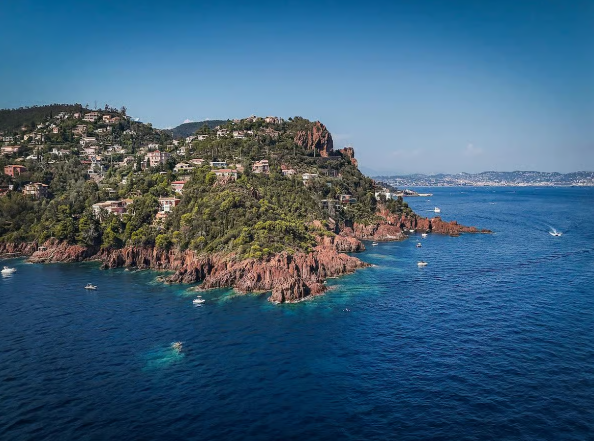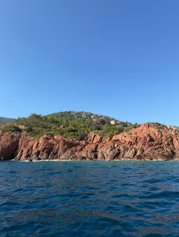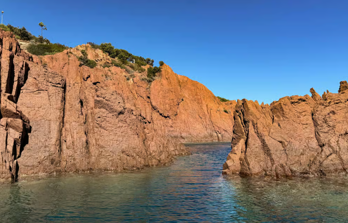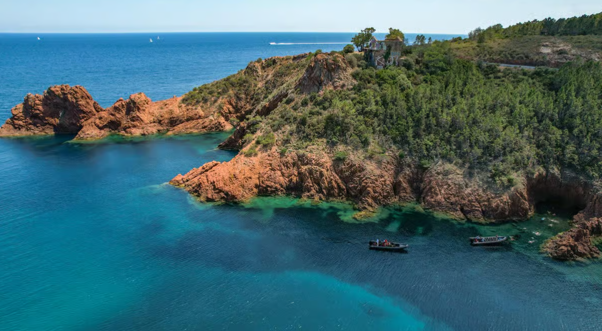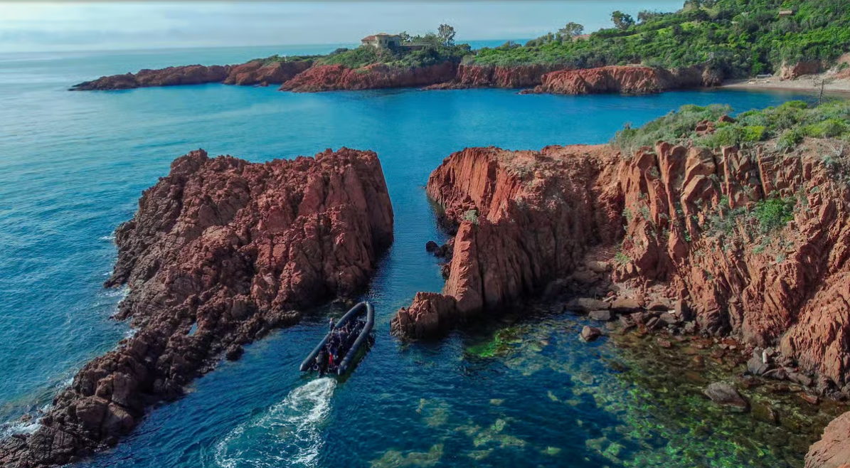 투어는 에스테렐 산맥(Estérel Massif)의 붉은 화산암 절벽과 해안을 따라 진행되는데, 이 산맥은 자연 그대로의 아름다운 풍경과 독특한 지질학적 특징으로 유명합니다. 절벽 곳곳을 누비며 숨겨진 칼랑크(작은 만)들과 해식동굴을 지나게 되어, 흥미로운 경관을 감상할 수 있습니다. 특히 테울 쉬르 메르(Théoule-sur-Mer) 주변은 푸른 바다와 붉은 절벽의 색 대비가 아름다워 많은 사진가들에게 잊지 못할 순간을 선사합니다.