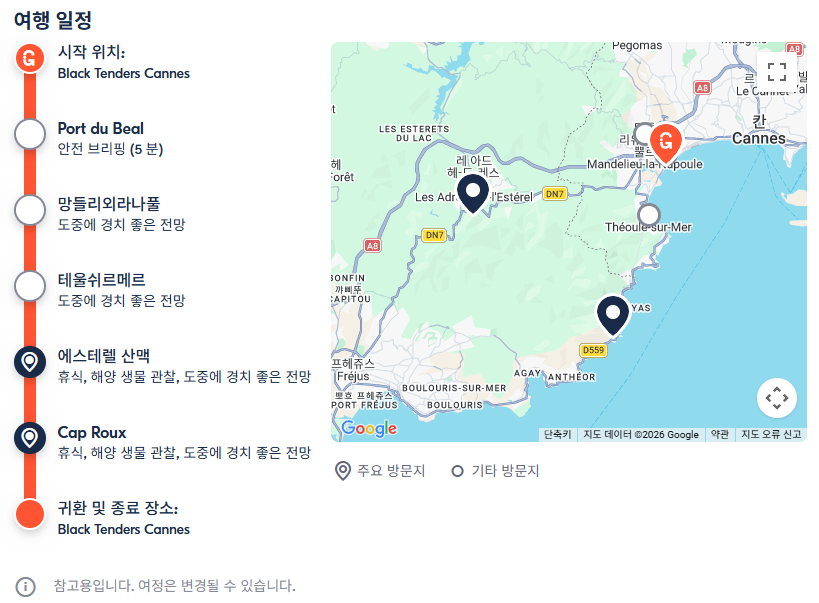이처럼 망들리외라나풀에서 출발하여 테울 쉬르 메르와 에스테렐 산맥, 그리고 Cap Roux를 잇는 보트 투어는 프라이빗하면서도 풍부한 자연 경험과 지중해 해안의 매력을 듬뿍 느낄 수 있는 완벽한 일정입니다. 자연과 바다, 그리고 고요한 휴식을 원하시는 분들께 강력히 추천드립니다.
