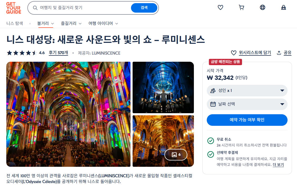니스 대성당 새로운 사운드와 빛의 쇼 루미니센스는 GET YOUR GUIDE 사이트에서 예약하실 수 있습니다. 사이트는 특히 전세계 대부분의 나라, 지역의 투어, 교통편 있어, 쉽게 찾을 수 없는 여행지의 다양한 투어 및 서비스를 이용할 수 있는 글로벌 사이트입니다. 전세계 여행자들이 많이 사용하는 사이트로 한국분들이 많이 예약하는 투어를 찾으신다면 klook 여행사이트 추천합니다. 함께 사용하시면 더욱 편하게 여행하실 수 있습니다.