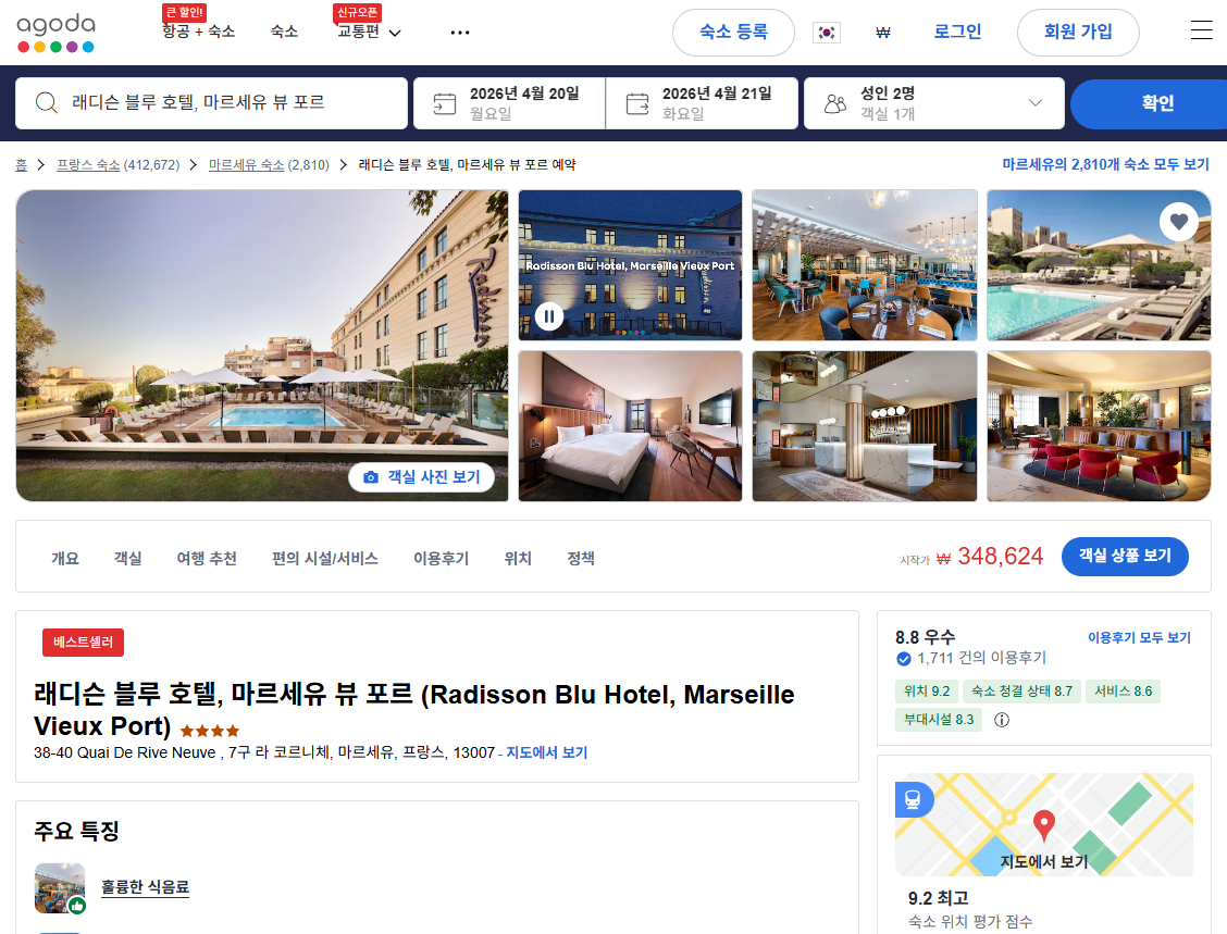 래디슨 블루 호텔, 마르세유 뷰 포르 (Radisson Blu Hotel, Marseille Vieux Port)의 1박당 요금 최저 가격대(세금 및 봉사료 포함)는 아고다웹사이트에서 할인특가 가격으로 매일매일 변동되며 객실에 따라 10만원대부터 다양하게 형성됩니다. 날짜별로 매일 가격이 다르므로 아고다웹사이트 최저가를 확인하시려면 아래 링크를 누르시고 원하는 날짜의 가격대를 선택해야 정확한 가격을 자세히 보실 수 있습니다.