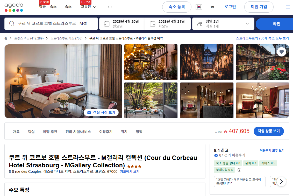 이처럼 쿠르 뒤 코르보 호텔 스트라스부르는 역사와 현대미를 갖춘 고급 숙소로, 뛰어난 위치와 서비스가 어우러져 스트라스부르 방문객들이 특별한 기억을 만들기에 매우 적합한 곳입니다. 쿠르 뒤 코르보 호텔 스트라스부르 - M갤러리 컬렉션 (Cour du Corbeau Hotel Strasbourg - MGallery Collection)의 1박당 요금 최저 가격대(세금 및 봉사료 포함)는 아고다웹사이트에서 할인특가 가격으로 매일매일 변동되며 객실에 따라 30 ~40만원대부터 다양하게 형성됩니다. 날짜별로 매일 가격이 다르므로 아고다웹사이트 최저가를 확인하시려면 아래 링크를 누르시고 원하는 날짜의 가격대를 선택해야 정확한 가격을 자세히 보실 수 있습니다.