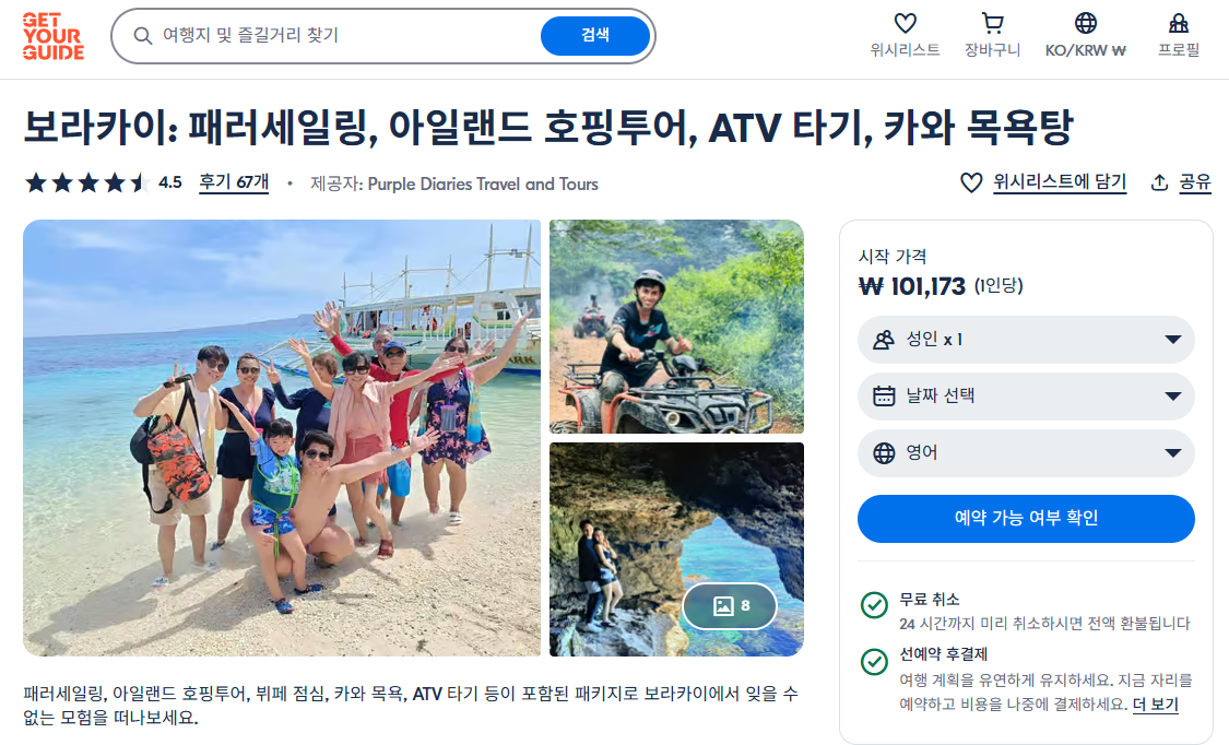 이처럼 보라카이의 주요 명소와 액티비티들은 각각 고유의 매력을 지니고 있어 가족 여행이나 친구, 연인과 함께 다양한 즐거움과 깊은 힐링을 누리기에 최적화되어 있습니다. 자연 경관의 아름다움과 액티비티가 어우러져 특별한 추억을 만드시길 응원합니다. 보라카이 패러세일링, 아일랜드 호핑투어, ATV 타기, 카와 목욕탕 패키지는 GET YOUR GUIDE 사이트에서 예약하실 수 있습니다. 사이트는 특히 전세계 대부분의 나라, 지역의 투어, 교통편 있어, 쉽게 찾을 수 없는 여행지의 다양한 투어 및 서비스를 이용할 수 있는 글로벌 사이트입니다. 전세계 여행자들이 많이 사용하는 사이트로 한국분들이 많이 예약하는 투어를 찾으신다면 klook 여행사이트 추천합니다. 함께 사용하시면 더욱 편하게 여행하실 수 있습니다.