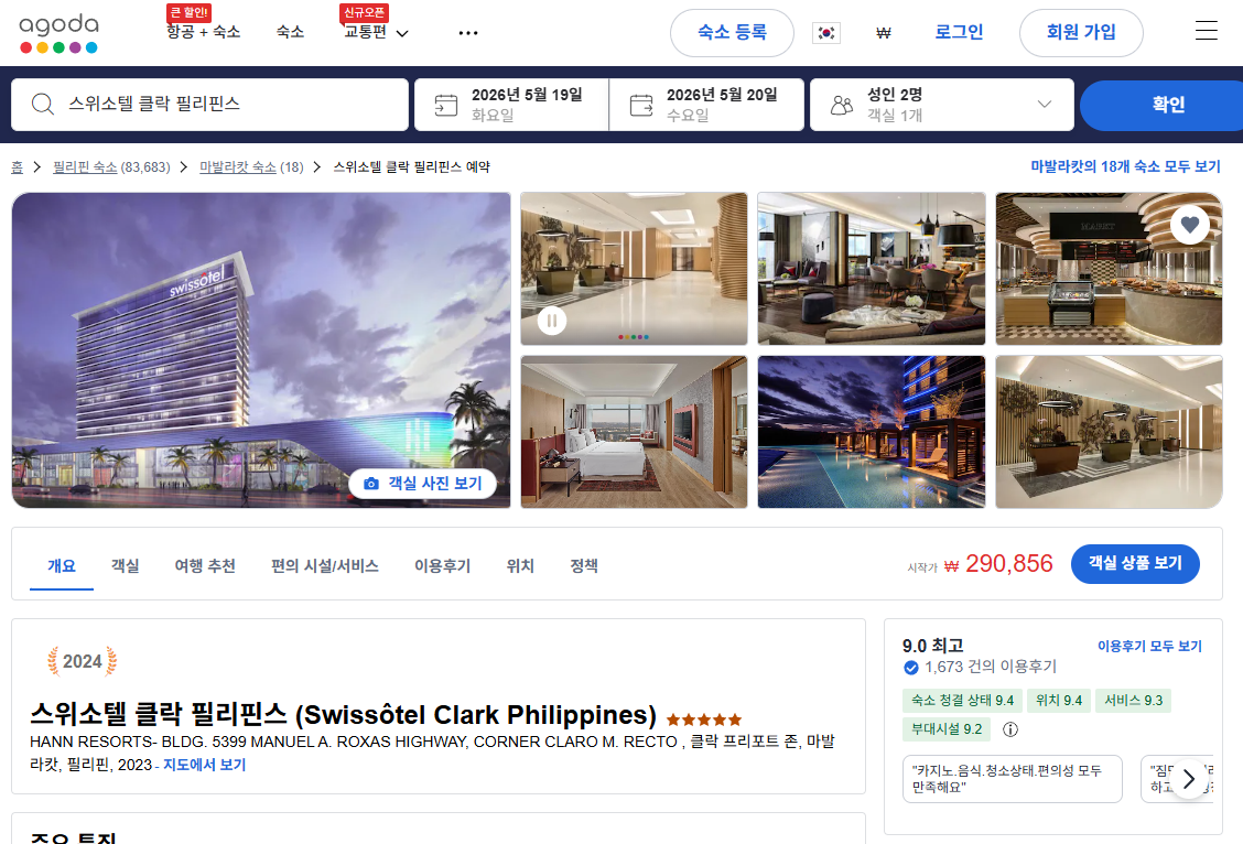 스위소텔 클락 필리핀스 (Swissotel Clark Philippines)의 1박당 요금 최저 가격대(세금 및 봉사료 포함)는 아고다웹사이트에서 할인특가 가격으로 매일매일 변동되며 객실에 따라 10만원대부터 다양하게 형성됩니다. 날짜별로 매일 가격이 다르므로 아고다웹사이트 최저가를 확인하시려면 아래 링크를 누르시고 원하는 날짜의 가격대를 선택해야 정확한 가격을 자세히 보실 수 있습니다.