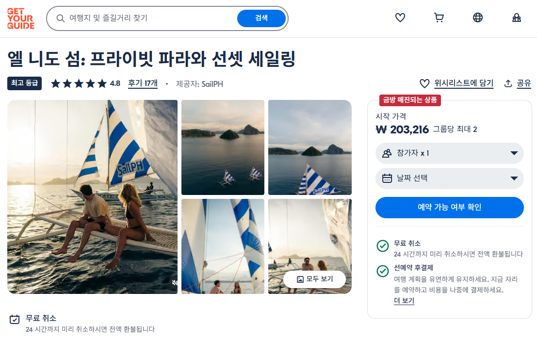 엘니도 프라이빗 파라와 선셋 세일링은 엘니도 항구에서 조금 떨어진 곳에 코롱코롱비치 근처에 미팅포인트가 있으며 GET YOUR GUIDE 사이트에서 예약하실 수 있습니다. 사이트는 특히 전세계 대부분의 나라, 지역의 투어, 교통편 있어, 쉽게 찾을 수 없는 여행지의 다양한 투어 및 서비스를 이용할 수 있는 글로벌 사이트입니다. 전세계 여행자들이 많이 사용하는 사이트로 한국분들이 많이 예약하는 투어를 찾으신다면 klook 여행사이트 추천합니다. 함께 사용하시면 더욱 편하게 여행하실 수 있습니다.