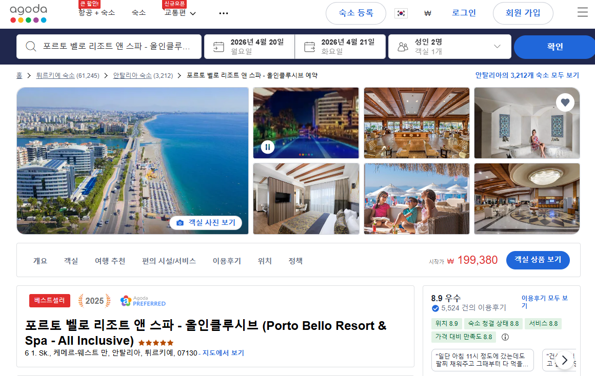 안탈리아 포르토 벨로 리조트 앤 스파 올인클루시브 (Porto Bello Resort & Spa - All Inclusive)의 1박당 요금 최저 가격대(세금 및 봉사료 포함)는 아고다웹사이트에서 할인특가 가격으로 매일매일 변동되며 20만원대부터 다양하게 형성됩니다. 날짜별로 매일 가격이 다르므로 아고다웹사이트 최저가를 확인하시려면 아래 링크를 누르시고 원하는 날짜의 가격대를 선택해야 정확한 가격을 자세히 보실 수 있습니다. 클룩에서도 예약가능하니 여행날짜에 맞춰 요금 및 옵션을 비교해서 예약하시는 것을 추천합니다.