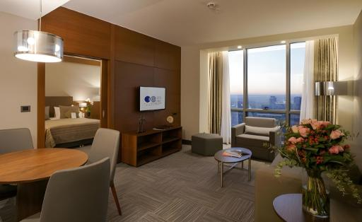 객실은 현대적이고 세심하게 설계되어 있어 편안함이 돋보입니다. 넓은 침대와 깔끔한 욕실, 고속 인터넷과 실용적인 업무 공간이 갖춰져 있어 출장 중에도 불편함이 적고, 가족과 함께 머물 경우에는 연결 객실이나 넉넉한 스위트 타입을 선택하면 편리합니다. 창 너머로 보이는 도심 풍경은 낮과 밤 모두 분위기가 좋아 사진 찍기에도 좋습니다.