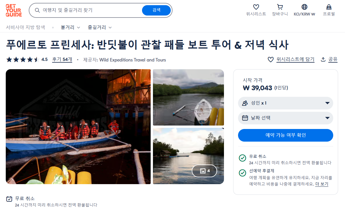 푸에르토 프린세사 저녁 식사가 포함된 반딧불이 관찰 패들 보트 투어는 GET YOUR GUIDE 사이트에서 예약하실 수 있습니다. 사이트는 특히 전세계 대부분의 나라, 지역의 투어, 교통편 있어, 쉽게 찾을 수 없는 여행지의 다양한 투어 및 서비스를 이용할 수 있는 글로벌 사이트입니다. 전세계 여행자들이 많이 사용하는 사이트로 한국분들이 많이 예약하는 투어를 찾으신다면 klook 여행사이트 추천합니다. 함께 사용하시면 더욱 편하게 여행하실 수 있습니다.