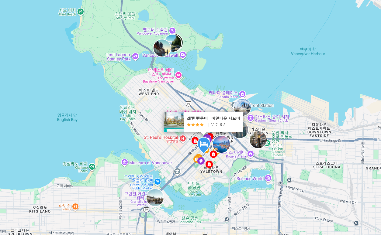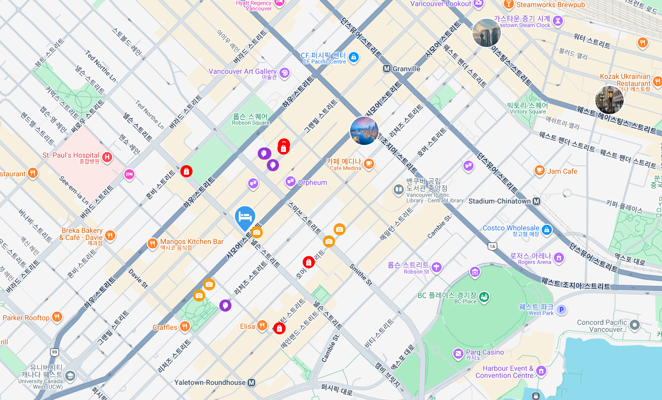 효율적 일정 운영: 주요 명소(스탠리 파크, 그랜빌 아일랜드, 로브슨 스트리트 등)로의 이동 시간이 짧아 관광·식사·쇼핑을 한정된 시간 안에 효율적으로 소화할 수 있습니다.