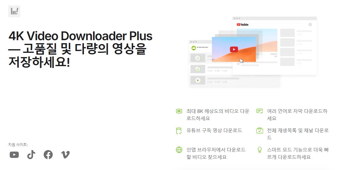 4K Downloader Plus는 유튜브, 비메오, 페이스북 등 다양한 동영상 플랫폼의 영상을 PC나 맥에 다운받아 저장할 수 있게 해주는 데스크톱 애플리케이션입니다. 이름처럼 4K 해상도 영상까지 지원하며, 단일 영상 다운로드뿐 아니라 재생목록, 채널 전체, 자막(SRT) 파일 추출, 오디오(음원) 변환 등 다양한 기능을 제공합니다. 사용 인터페이스가 직관적이라 초보자도 비교적 쉽게 접근할 수 있고, 고급 설정을 통해 화질·포맷·저장 위치 등을 세밀하게 제어할 수 있습니다.