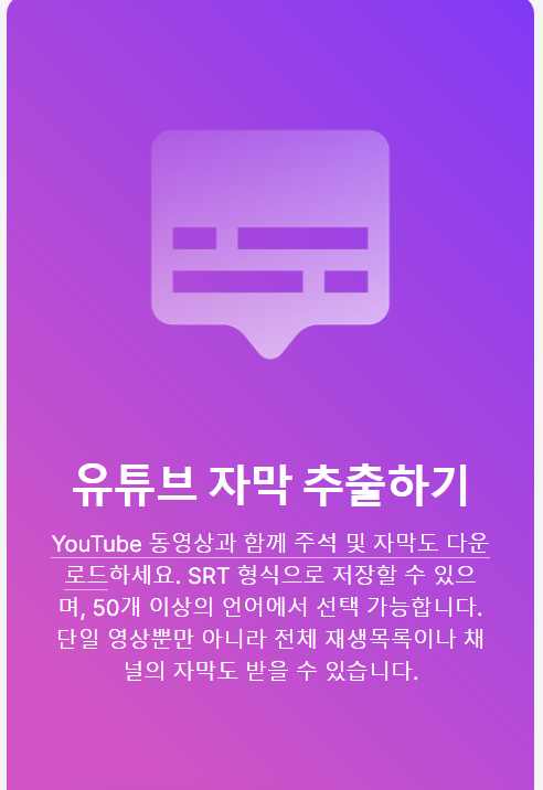 자막 추출: 영상과 함께 자막(.srt) 파일을 별도로 저장하거나 영상에 자막을 하드코딩(내장)하는 옵션을 선택할 수 있습니다. 다국어 자막이 제공되면 원하는 언어를 지정해 다운로드하세요.